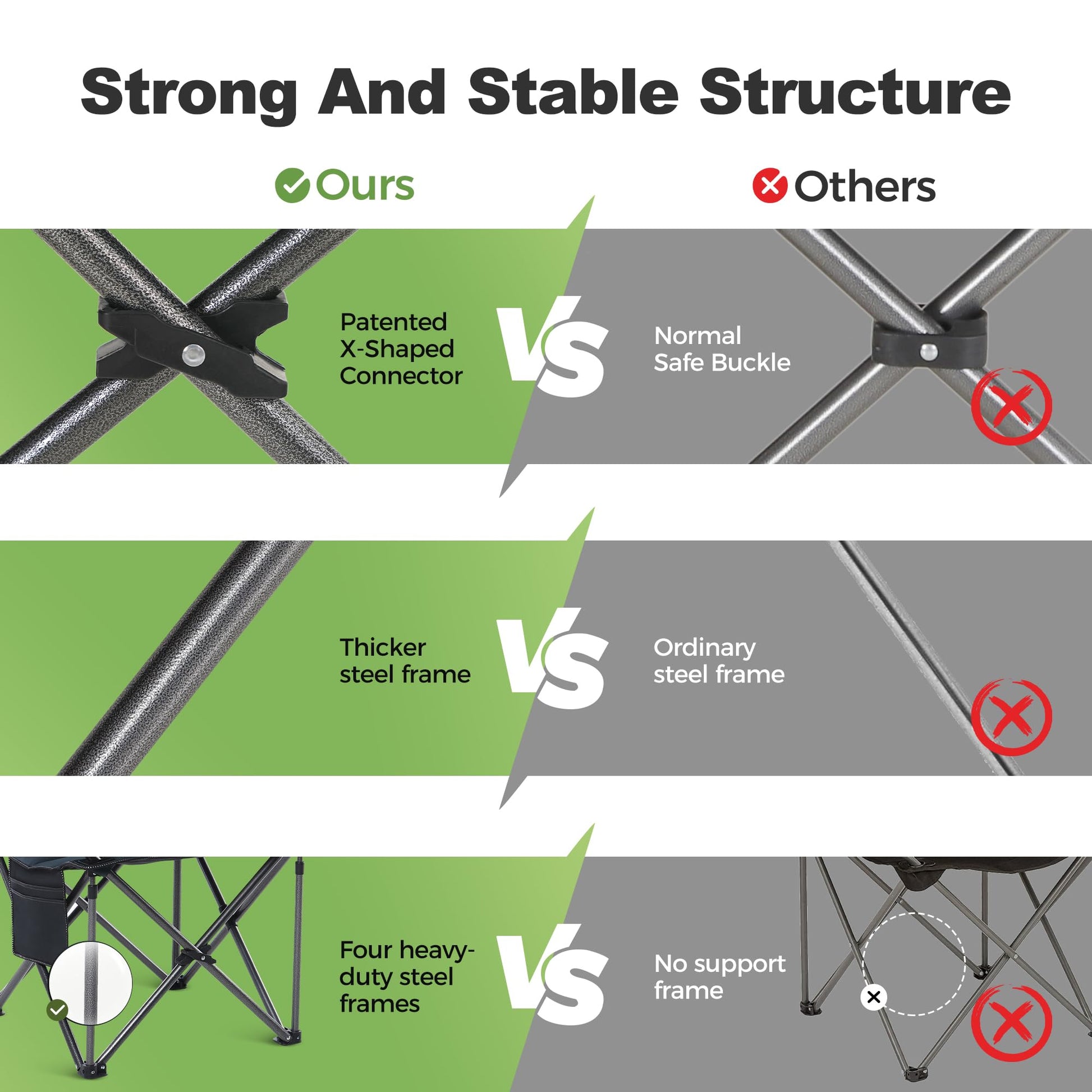 Stabilität, auf die Sie sich verlassen können: Dank des massiven Stahlrahmens und des reissfesten Gewebes bietet dieser Faltstuhl auch auf unebenem Untergrund einen sicheren und festen Stand. Die hohe Belastbarkeit von 200 kg macht ihn zur perfekten Wahl für jeden Körpertyp und garantiert eine lange Lebensdauer.