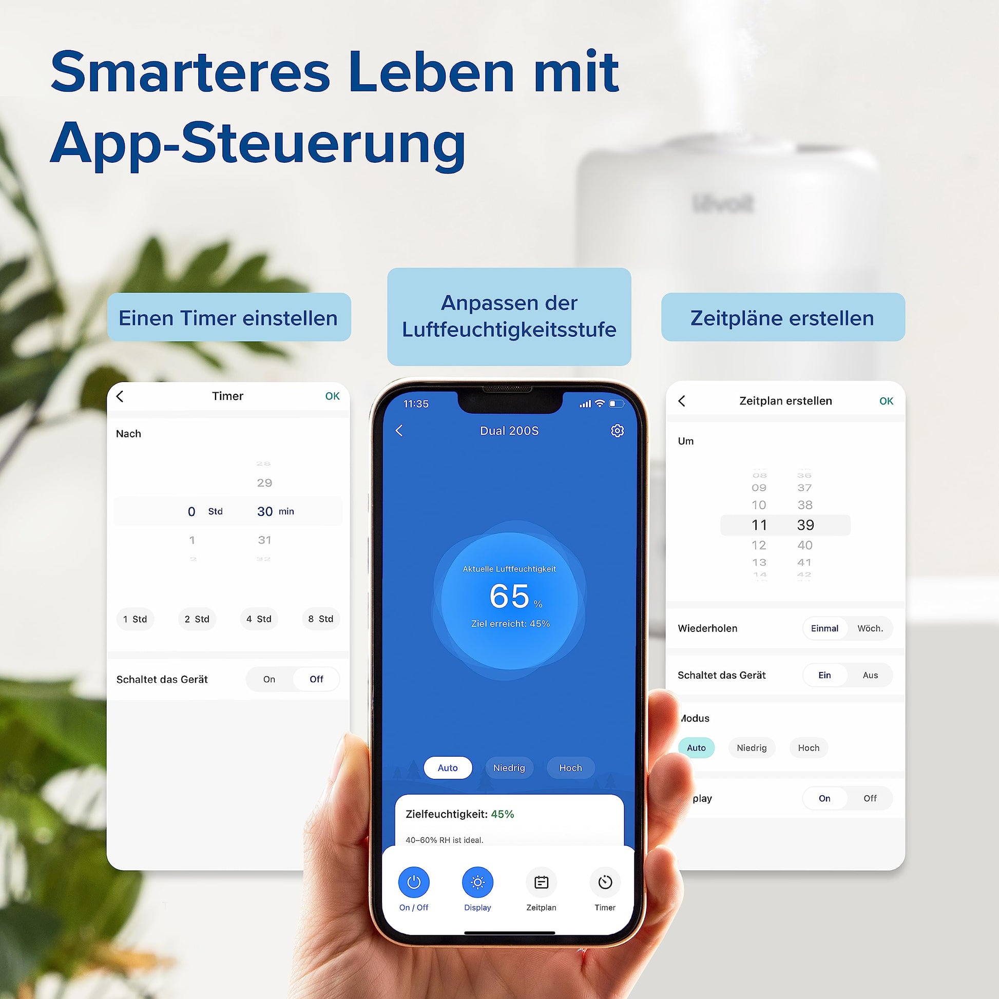 - Smarte Steuerung: Vollständige Kontrolle über die VeSync-App, inklusive Zeitplanung und Ziel-Luftfeuchtigkeit.