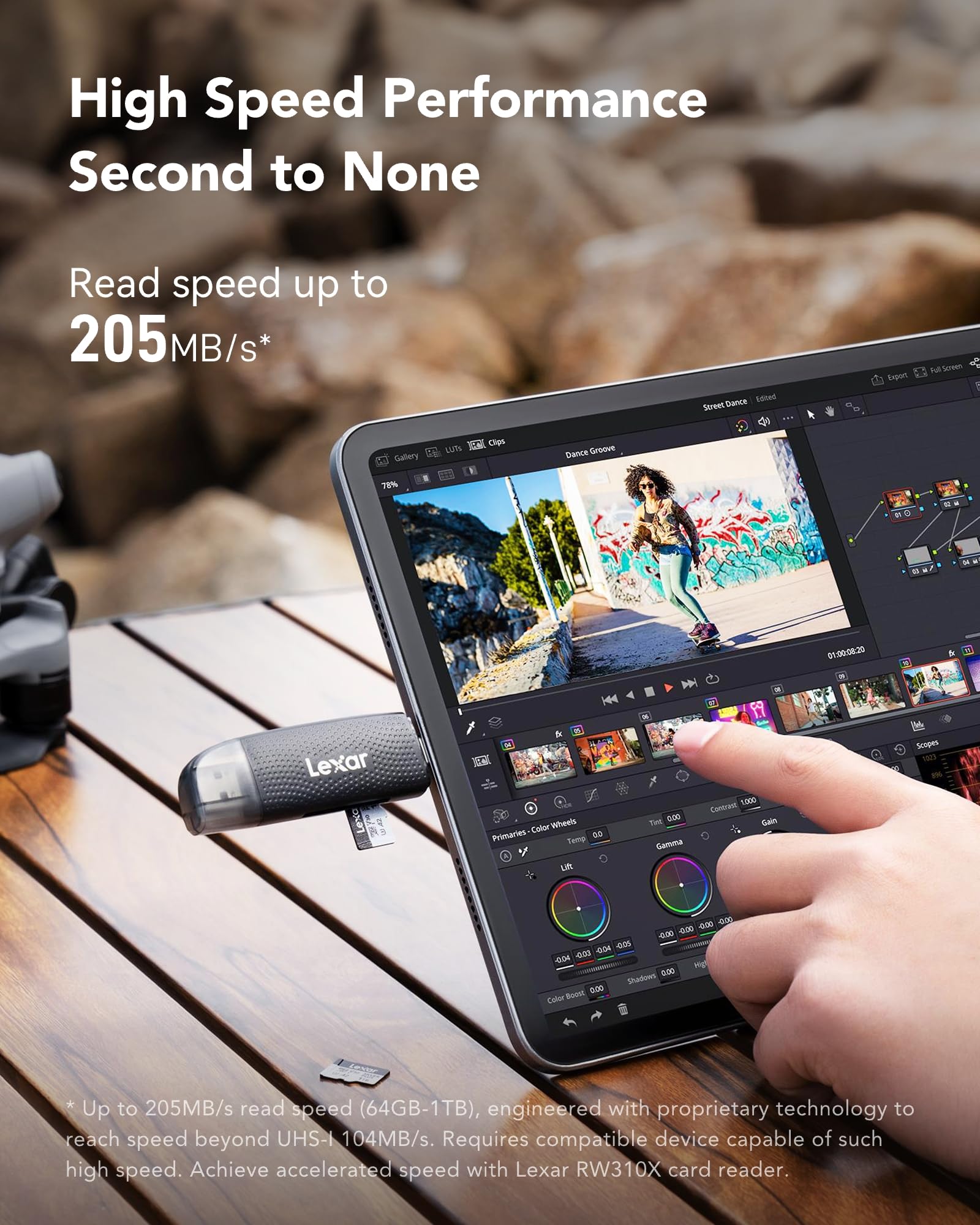 Lexar verwendet eine spezielle Technologie, um die Standard-UHS-I-Grenze von 104 MB/s zu übertreffen. Um die maximale Lesegeschwindigkeit von 205 MB/s zu erreichen, ist ein kompatibles Lesegerät oder Endgerät erforderlich, das diese Technologie unterstützt. In herkömmlichen UHS-I-Geräten arbeitet die Karte mit der maximal unterstützten Geschwindigkeit des jeweiligen Geräts.