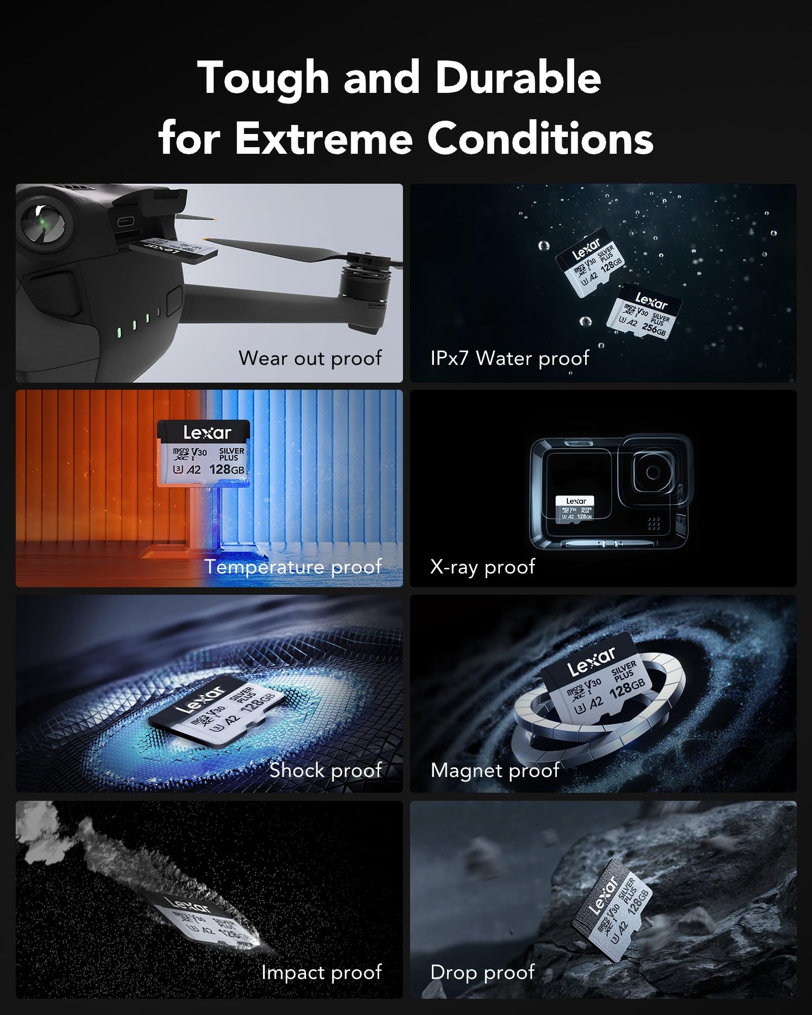 Für jedes Abenteuer gerüstet: Diese Speicherkarte wurde für Langlebigkeit entwickelt. Sie ist stossfest, vibrationssicher, temperaturbeständig, röntgensicher und unempfindlich gegenüber Magnetfeldern. So sind Ihre Daten auch unter anspruchsvollen Bedingungen sicher geschützt.