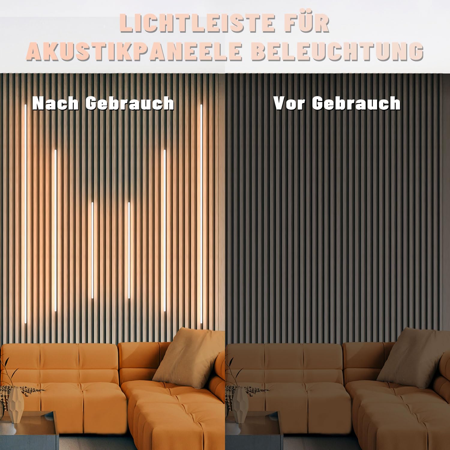 Verwandeln Sie Ihre Akustikpaneele in ein stilvolles Designelement mit diesem massgeschneiderten LED-Beleuchtungsset. Es wurde speziell dafür entwickelt, sich nahtlos in die Struktur Ihrer Wandpaneele einzufügen und eine warme, einladende Atmosphäre zu schaffen.