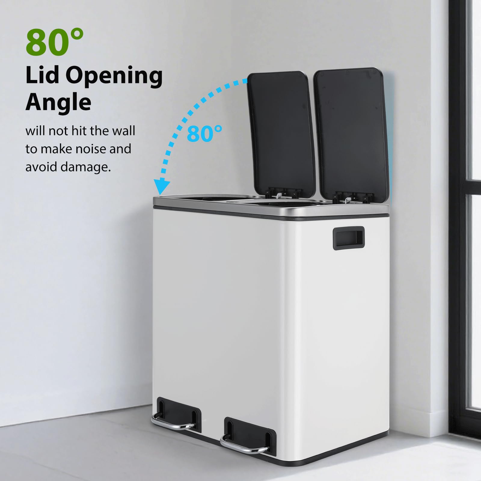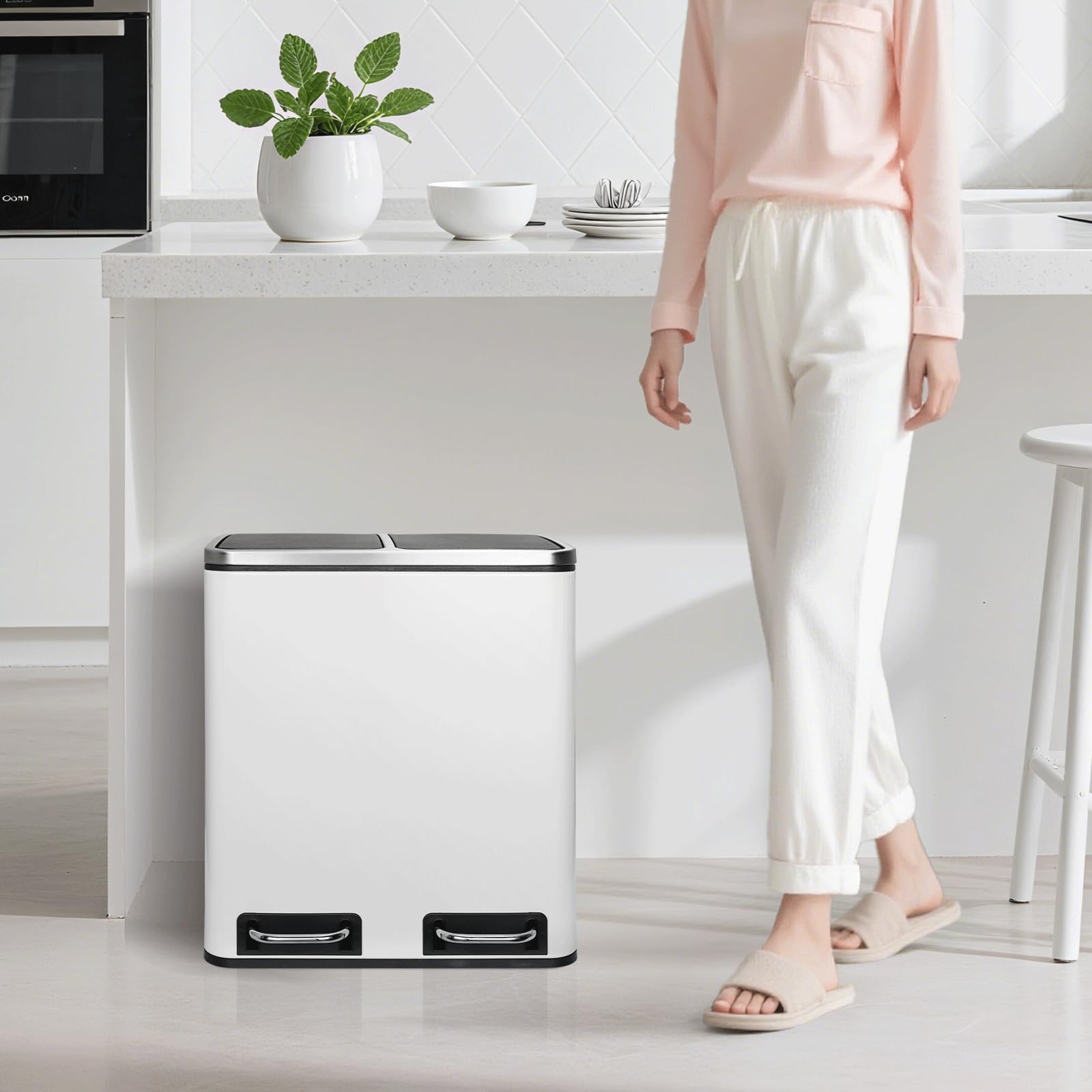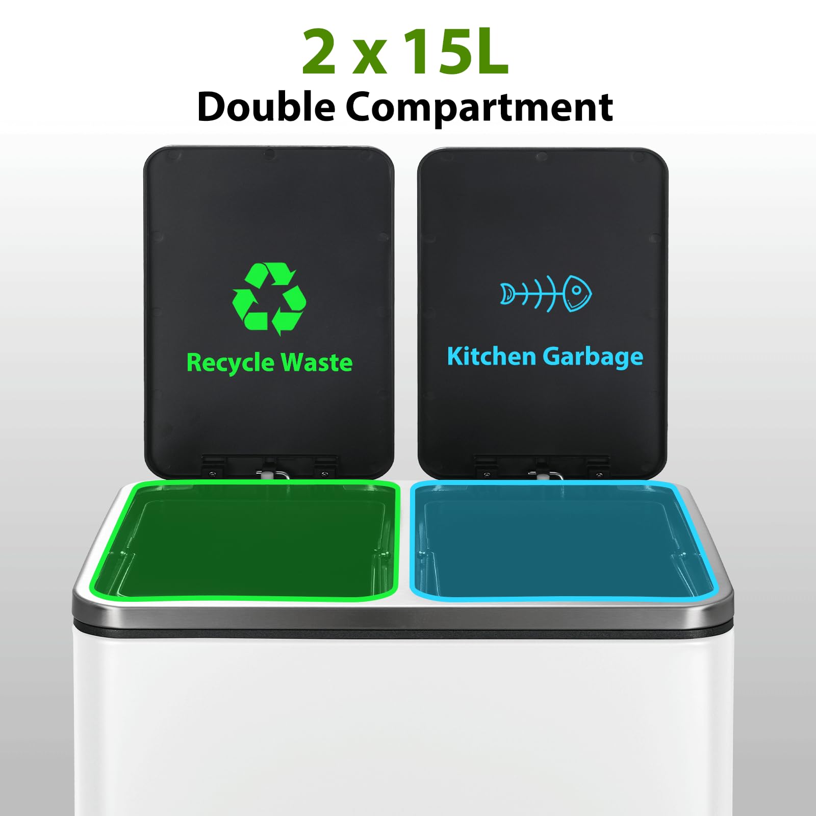 Mit einem Gesamtvolumen von 30 Litern, aufgeteilt in zwei separate 15-Liter-Fächer, ist dieser Abfalleimer ideal für Single-Haushalte, Paare und kleine Familien. Er ist perfekt dimensioniert, um den täglichen Abfall aufzunehmen und die Mülltrennung zu vereinfachen.