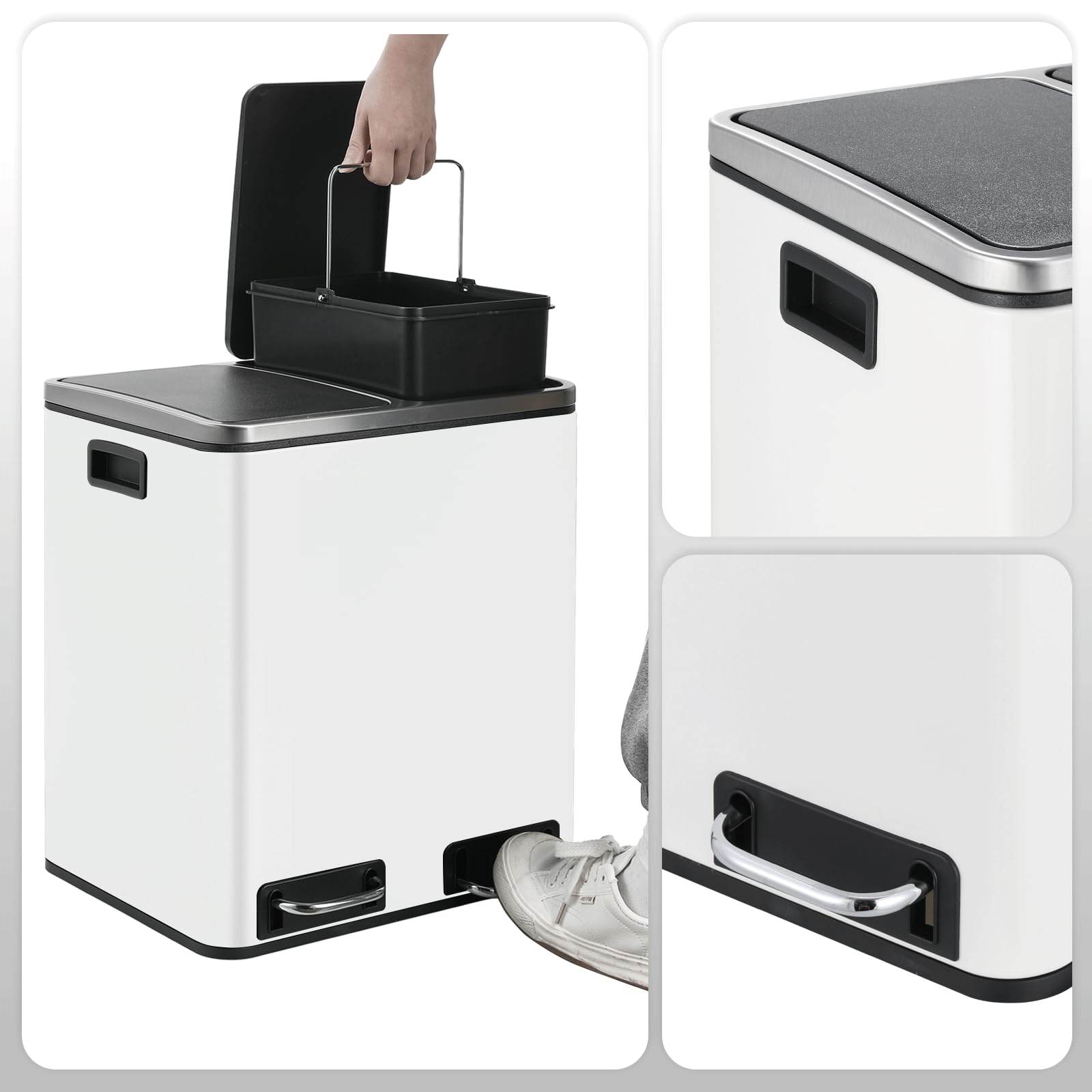 - Inneneimer: Beide Eimer sind einzeln herausnehmbar und mit praktischen Metallgriffen versehen.