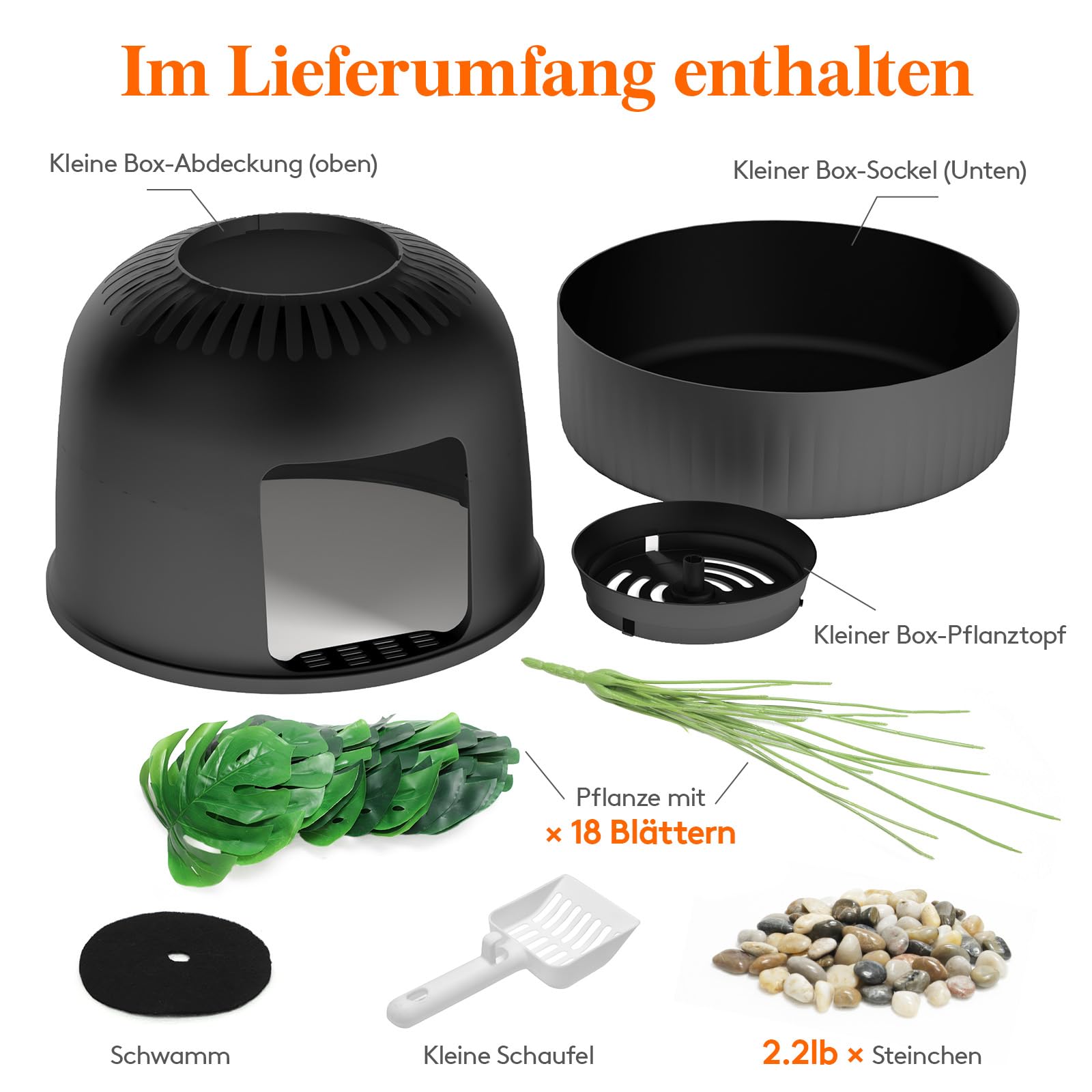 - Lieferumfang: Katzentoilette (2-teilig), Kunstpflanze, Zierkiesel, Streuschaufel mit Halterung, 1x Aktivkohlefilter