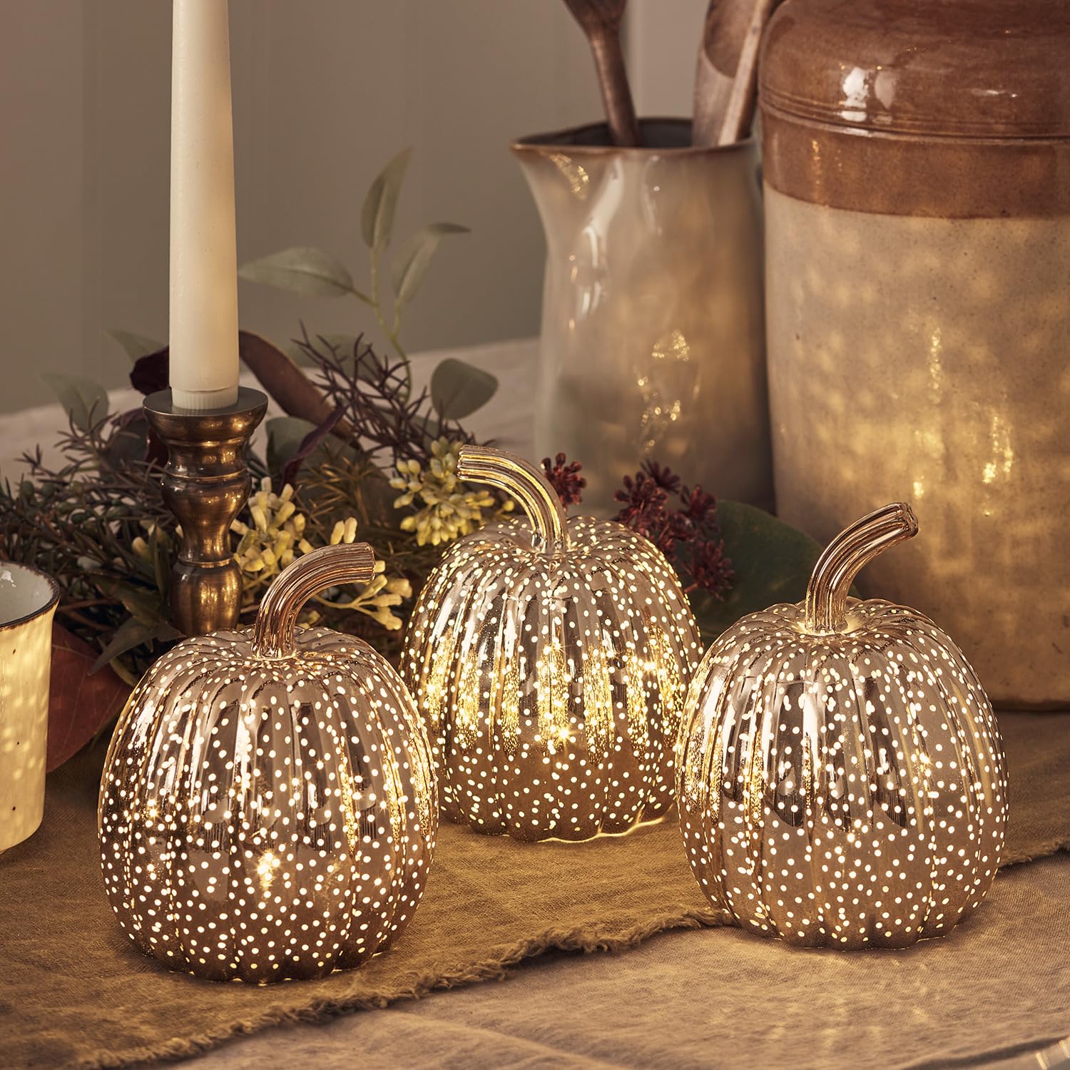 Bringen Sie mit diesem zauberhaften Trio aus Glas-Kürbissen eine warme und festliche Stimmung in Ihr Zuhause. Die goldfarbenen Dekorationsobjekte werden von innen sanft beleuchtet und sind das perfekte Highlight für Ihre Herbst- und Halloween-Dekoration.