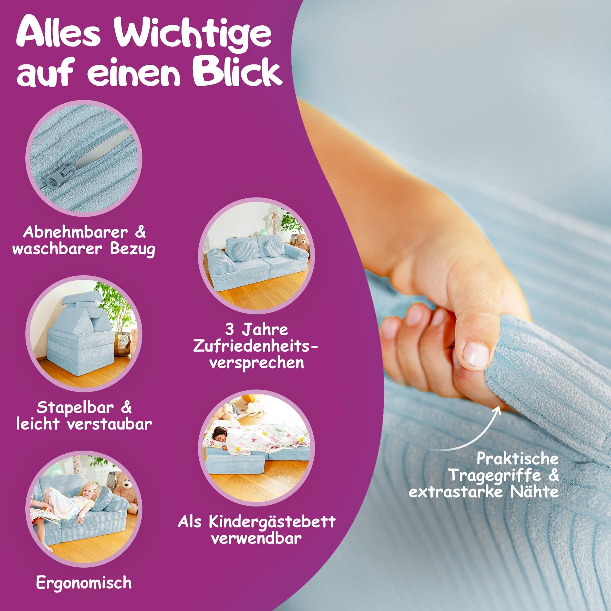 Das Spielsofa ist für Kleinkinder und Kinder konzipiert, die Freude am Bauen und kreativen Spielen haben. Ja, es lässt sich im Handumdrehen in ein gemütliches Gästebett verwandeln und ist somit ideal für kleine Übernachtungsfreunde.