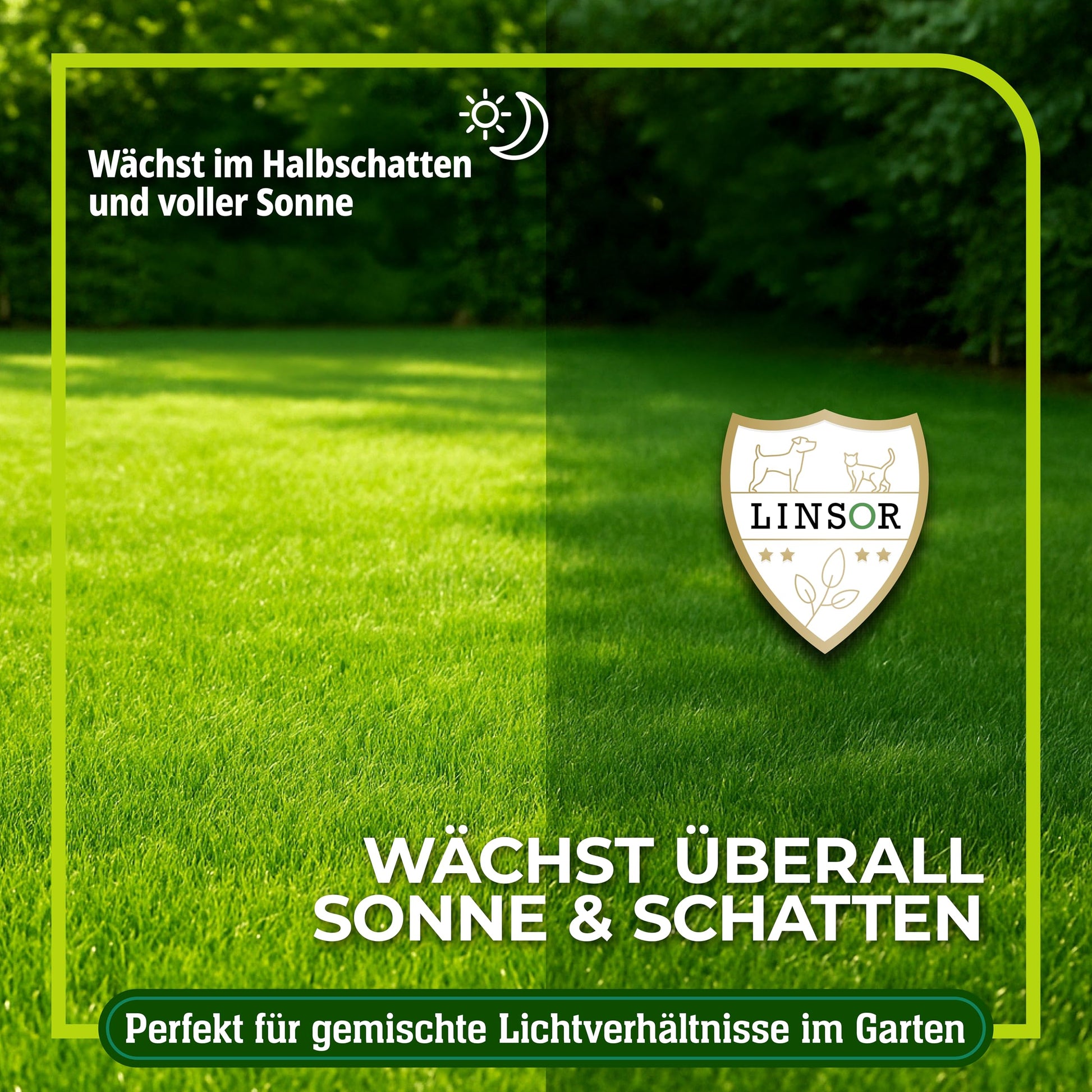 - Sonne & Schatten: Die spezielle Mischung gedeiht zuverlässig sowohl in sonnenverwöhnten als auch in schattigen Lagen und sorgt für ein gleichmässiges Grün.