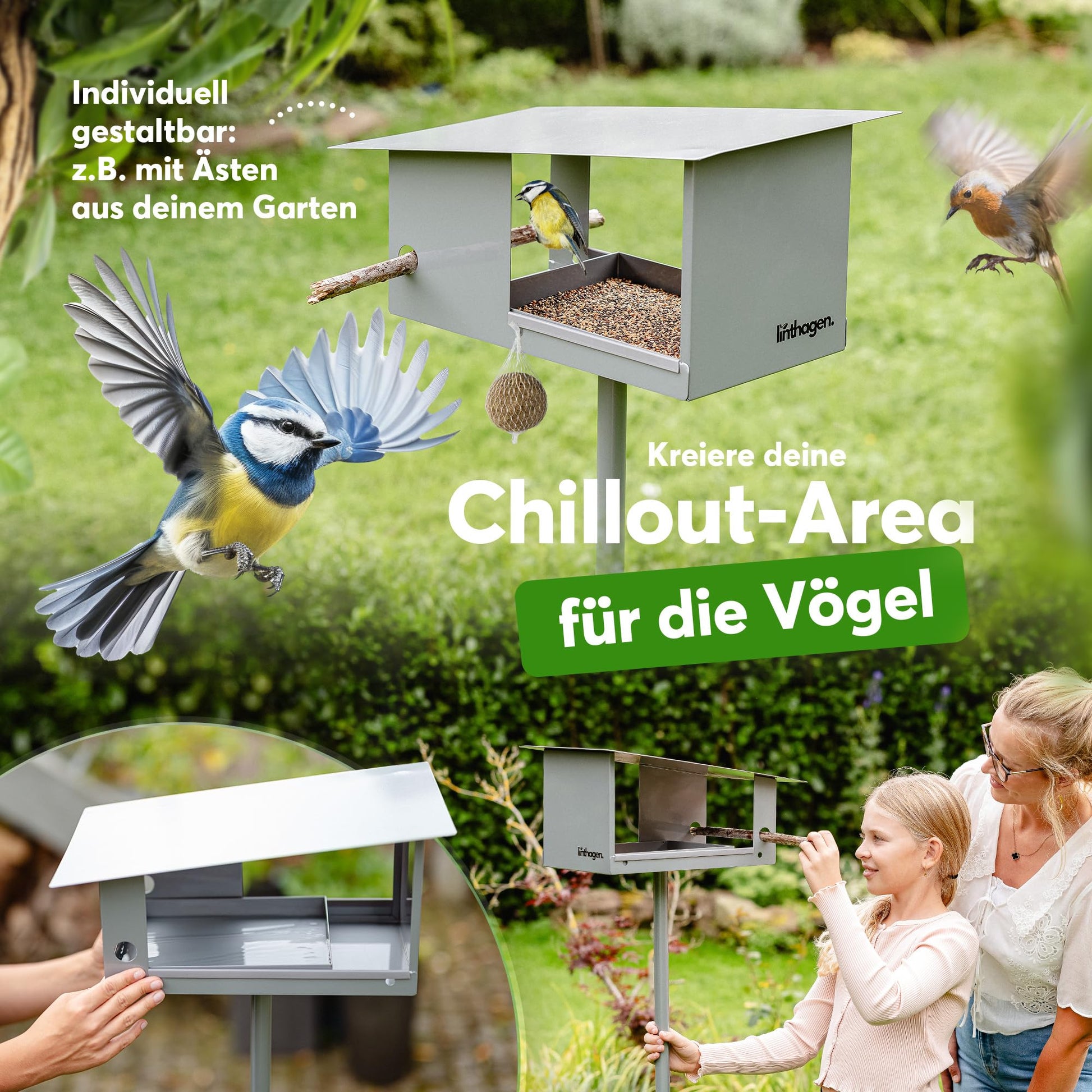 Ja, das Design ist flexibel gestaltet. An den zusätzlich integrierten Haken können Sie ganz einfach Meisenknödel oder anderes Vogelfutter zum Aufhängen anbringen und so das Futterangebot für verschiedene Vogelarten erweitern.