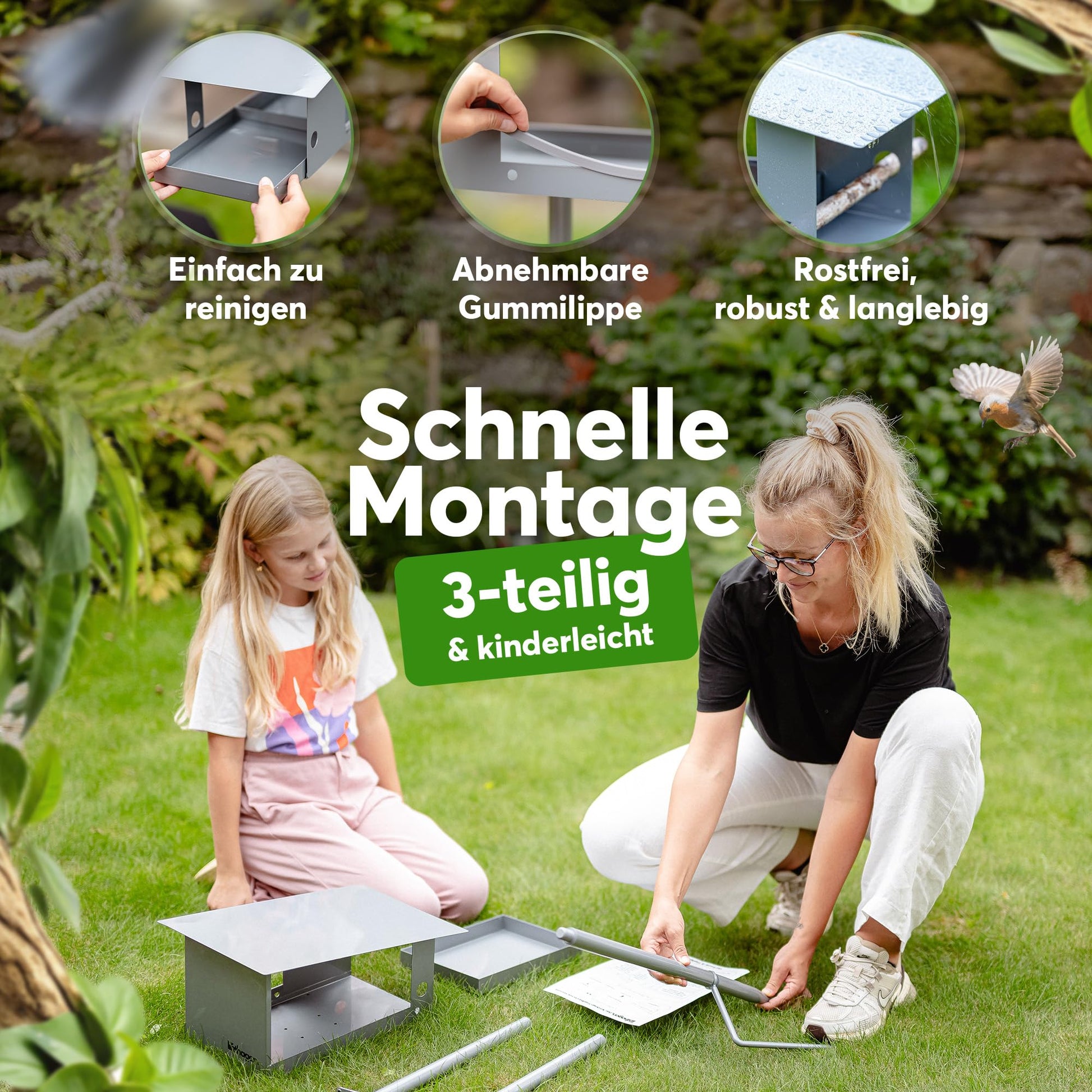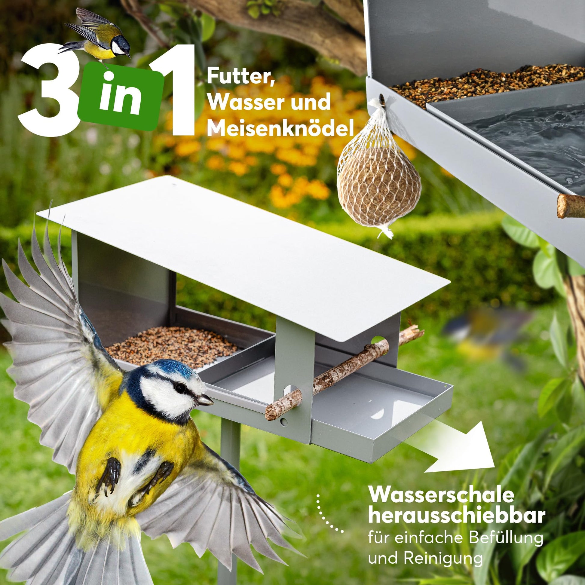 - Multifunktionales 3-in-1-System: Bietet eine Futterstelle, eine Wasserquelle und ein Vogelbad in einer einzigen, stilvollen Einheit.