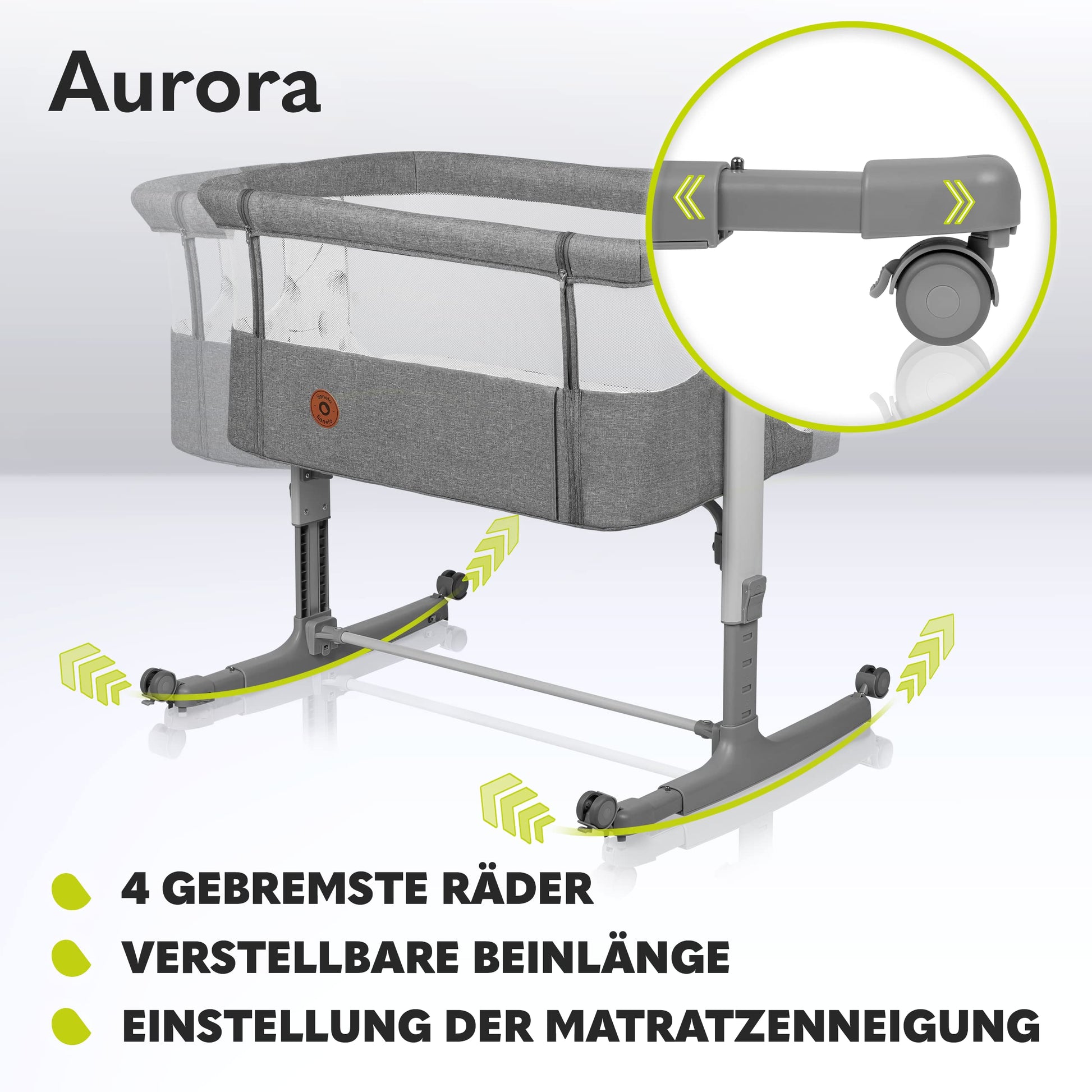 Das Aurora ist ein multifunktionales 3-in-1-Produkt: Es dient als sicheres Beistellbett direkt am Elternbett, als sanfte Wiege zum Beruhigen Ihres Babys und als vollwertiges, freistehendes Babybett.