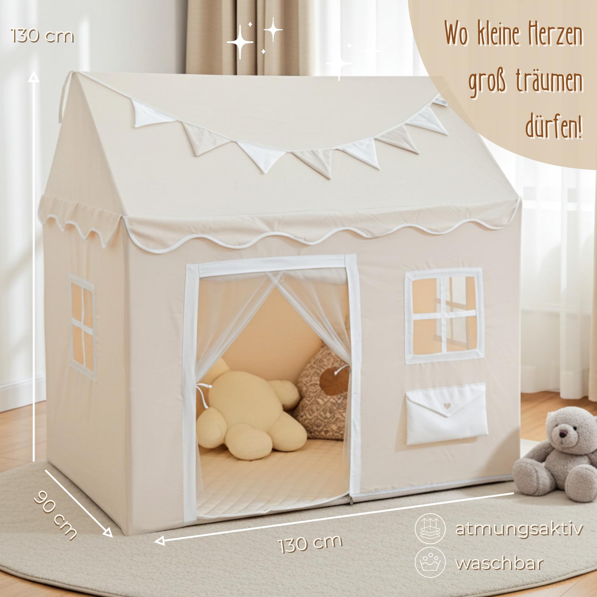 Verwandeln Sie das Kinderzimmer in ein kleines Reich der Fantasie. Dieses liebevoll gestaltete Spielhaus ist mehr als nur ein Zelt – es ist ein persönlicher Rückzugsort, der zum Träumen und Spielen einlädt und dabei die Entwicklung Ihres Kindes auf wertvolle Weise unterstützt.