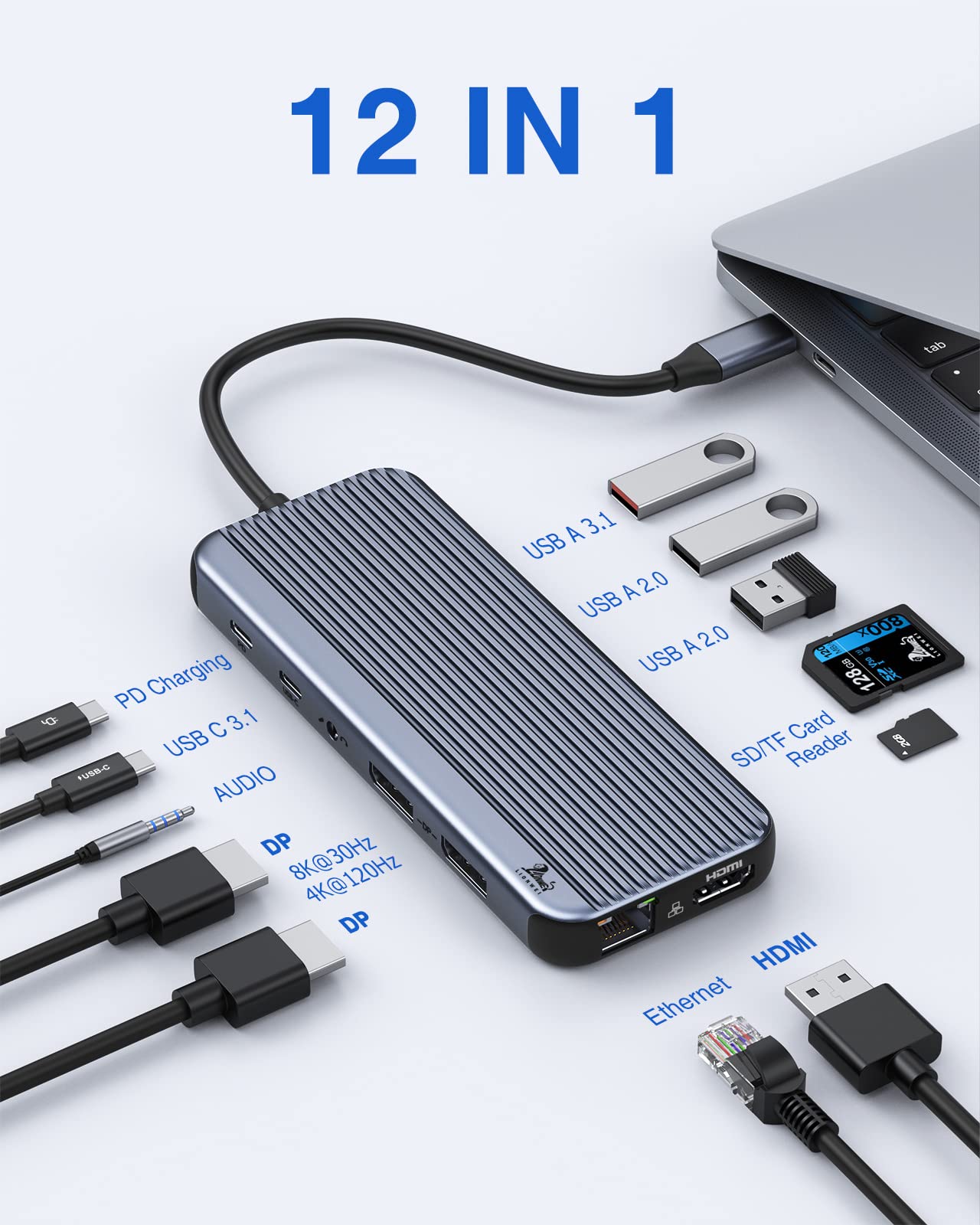 - Umfassende 12-in-1 Konnektivität: Erweitert einen USB-C-Port auf zwölf Anschlüsse, inklusive 2x DisplayPort, 1x HDMI, schnellem USB 3.1, USB 2.0, 100W Power Delivery und mehr.