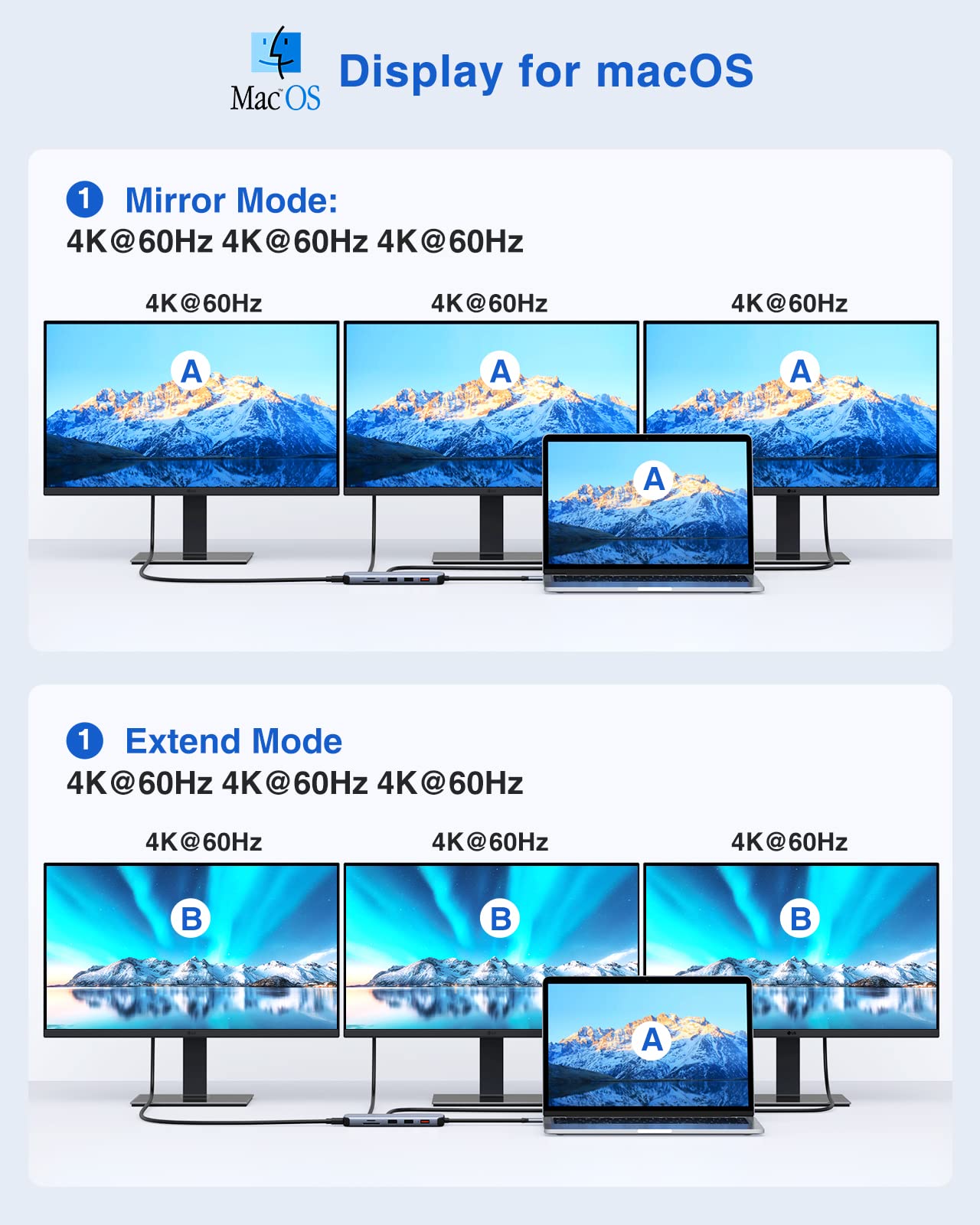 Ob für Videobearbeitung, Grafikdesign oder anspruchsvolles Multitasking – die Unterstützung für bis zu drei Bildschirme und eine beeindruckende 8K-Auflösung bietet Ihnen die nötige Flexibilität und Detailtreue. Der Hub ist die ideale Lösung, um Ihren Workflow zu beschleunigen und effizienter zu gestalten. Hinweis für Mac-Benutzer: Unter macOS wird das Bild auf externen Monitoren gespiegelt. MacBook-Modelle mit M1/M2-Chip unterstützen den Anschluss von maximal einem externen Bildschirm.