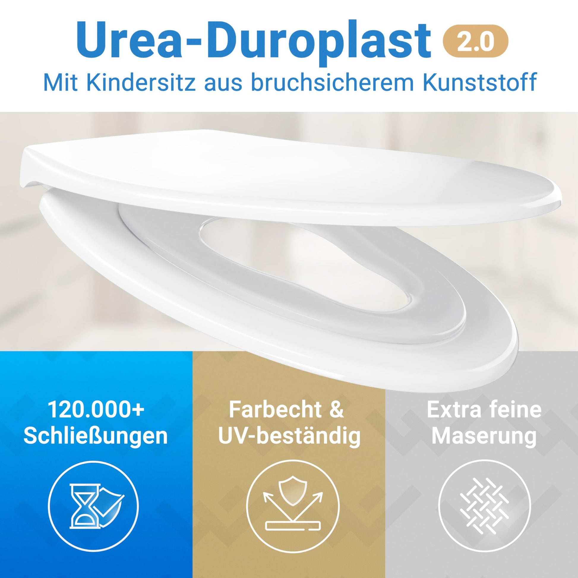 Der WC-Sitz ist aus einem robusten, antibakteriellen und UV-beständigen Material gefertigt, das eine hohe Tragkraft von über 150 kg gewährleistet. Dies sorgt für Stabilität und eine lange Lebensdauer im Familienalltag.
