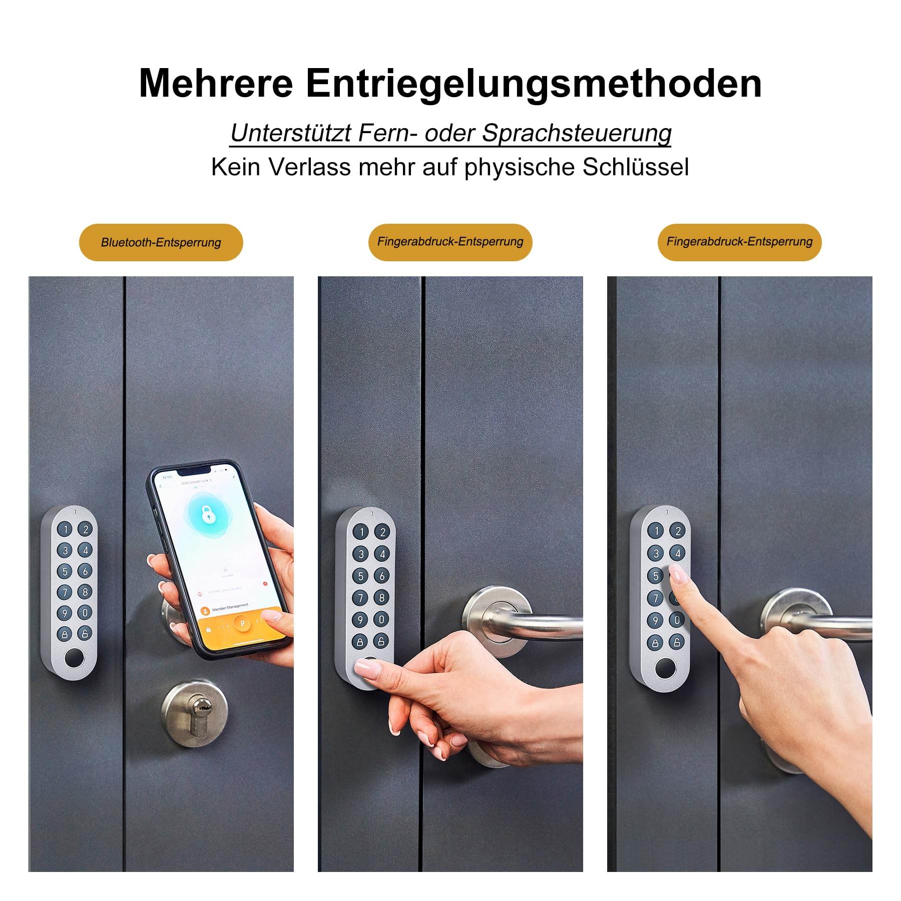 - Flexible Zutrittsmöglichkeiten: Öffnen Sie Ihre Tür bequem per Fingerabdruck, individuellem Passwort, Bluetooth oder Sprachbefehl.