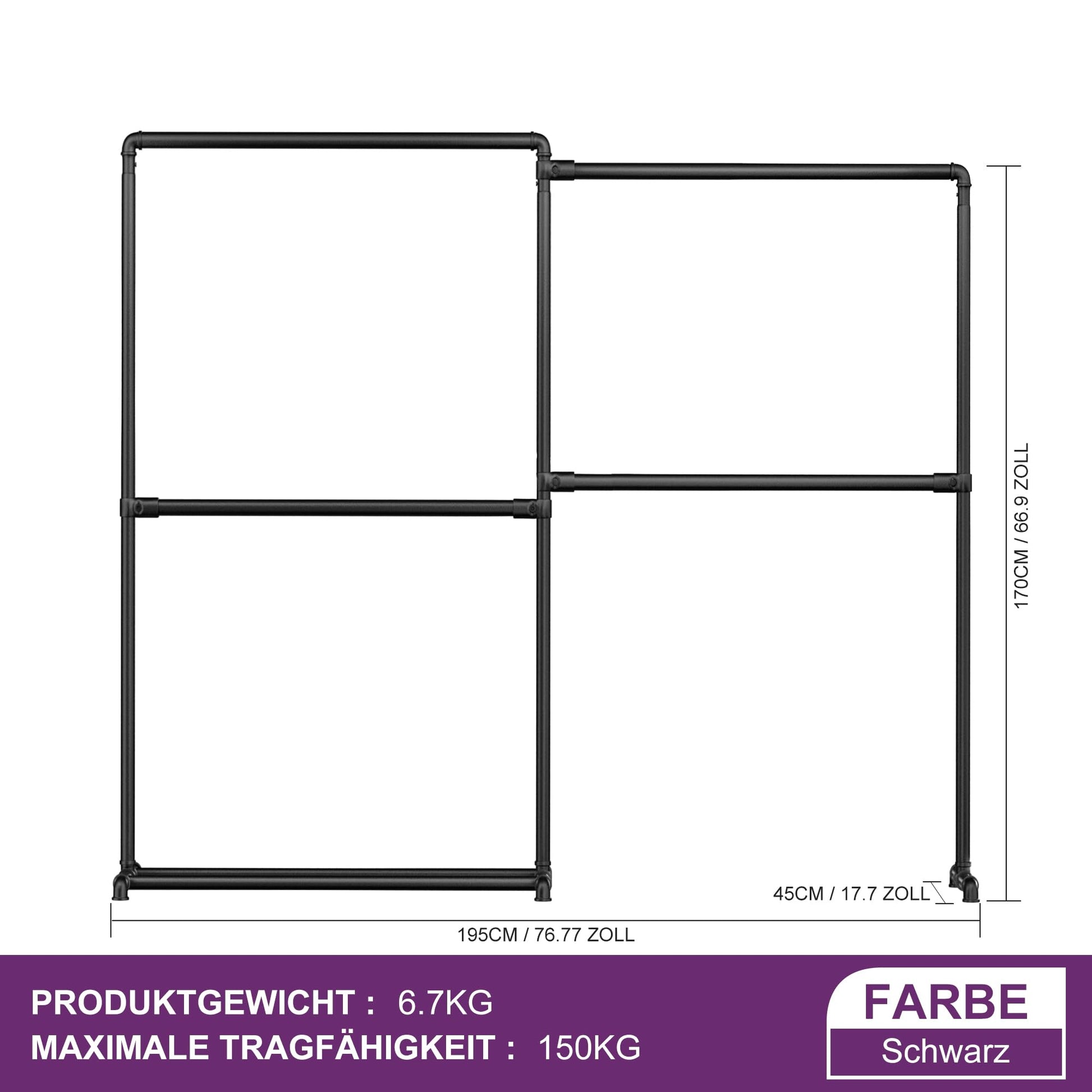 Der Kleiderständer ist äusserst belastbar und für eine maximale Tragkraft von bis zu 150 kg ausgelegt. Mit seinen vier Kleiderstangen und den grosszügigen Massen von 195 × 170 cm bietet er problemlos Platz für über 320 einzelne Kleidungsstücke, von leichten Blusen bis zu schweren Wintermänteln.