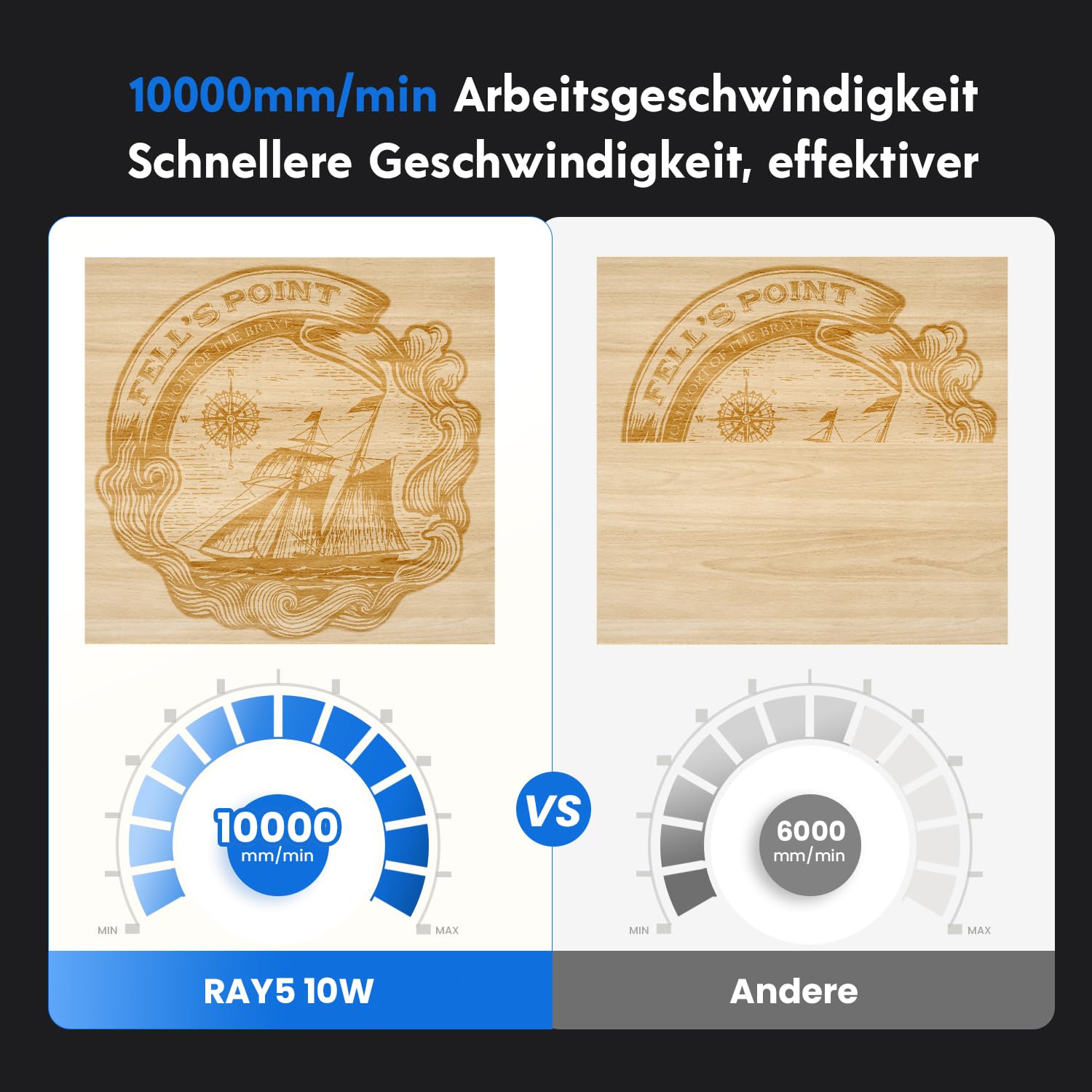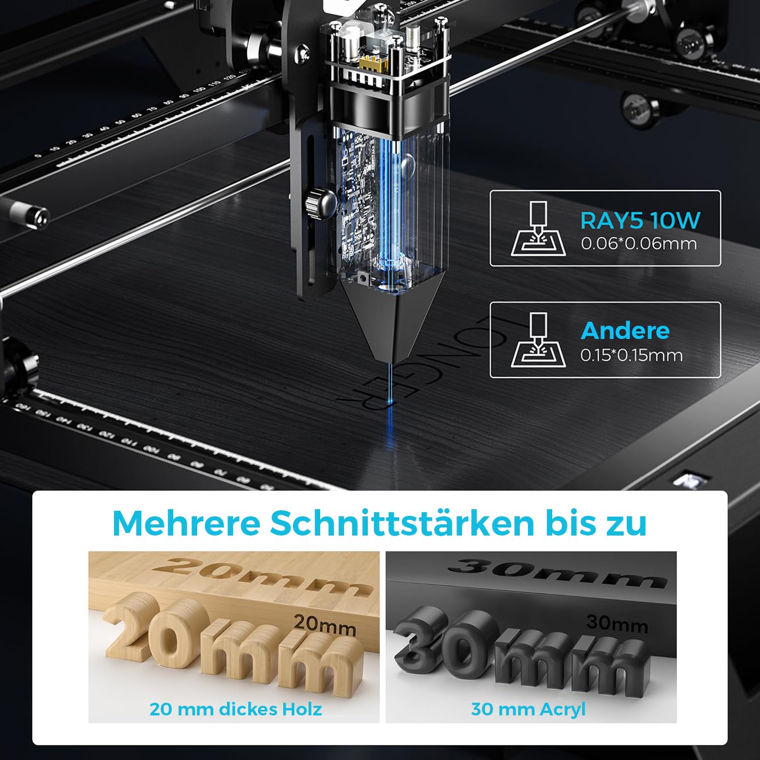 - Leistungsstarker 10W Laser: Dank fortschrittlicher Dual-Strahl-Technologie erreicht das Gerät Geschwindigkeiten von bis zu 10'000 mm/min und schneidet mühelos durch 20 mm dicke Holzplatten oder 30 mm dickes Acryl.