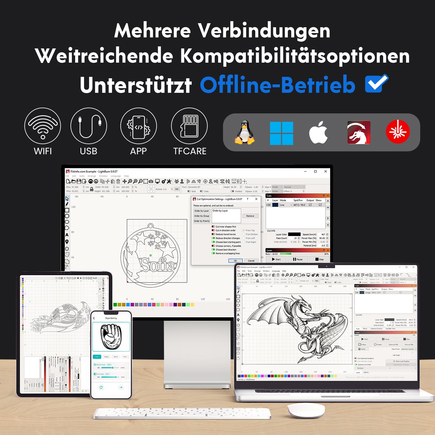 Arbeiten Sie so, wie es für Sie am besten passt. Die vielfältigen Verbindungsoptionen und die Möglichkeit des Offline-Betriebs geben Ihnen die Freiheit, den Gravierer unabhängig von einem Computer zu verwenden. Dies maximiert Ihre Flexibilität und Effizienz bei jedem Projekt.
