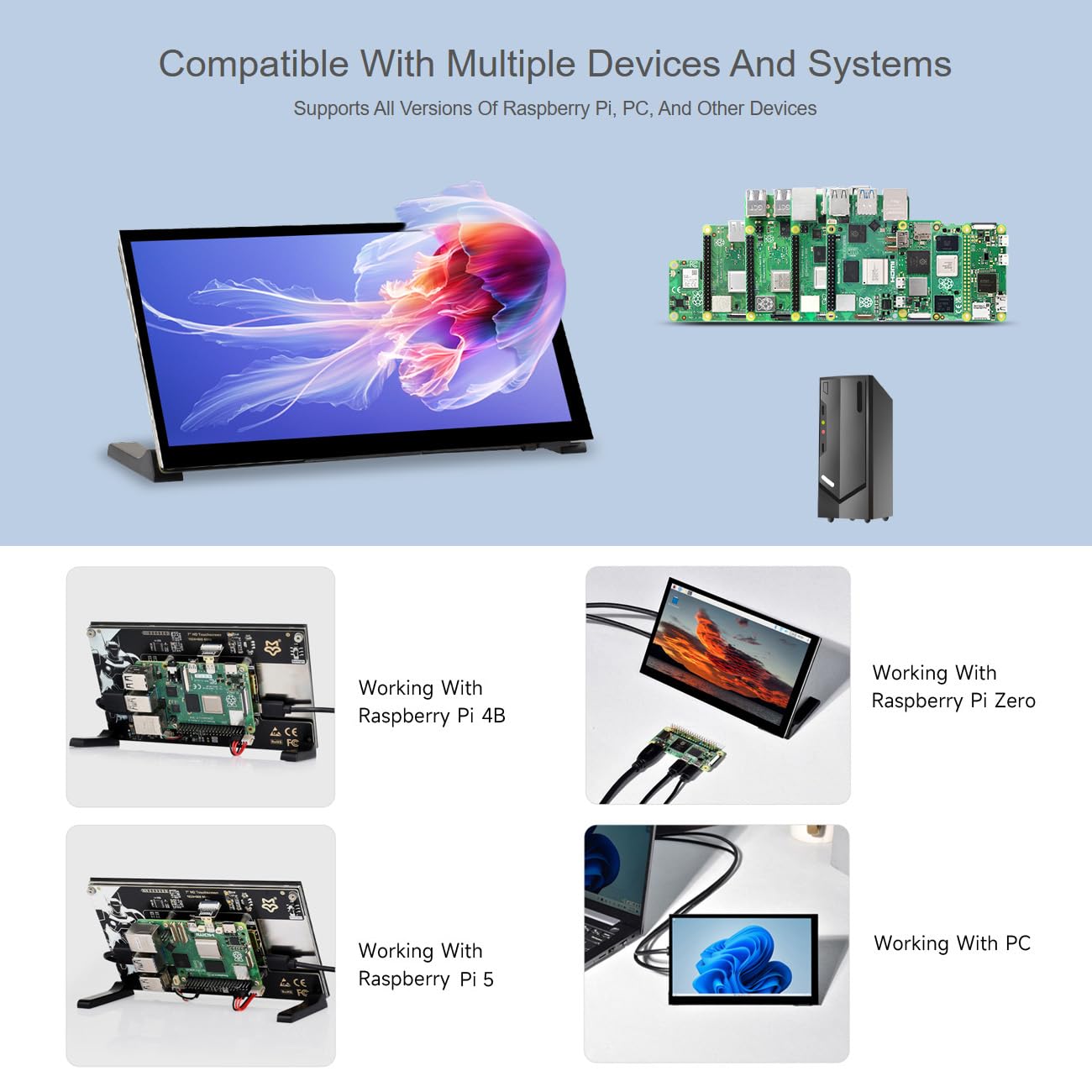 Dieser Bildschirm ist extrem vielseitig. Er unterstützt nahtlos alle Versionen des Raspberry Pi, einschliesslich Pi 5, 4B, 3B+ und Pi Zero. Darüber hinaus funktioniert er als Plug-and-Play-Zweitbildschirm für Laptops und PCs mit Windows 7, 8, 8.1, 10 und 11.