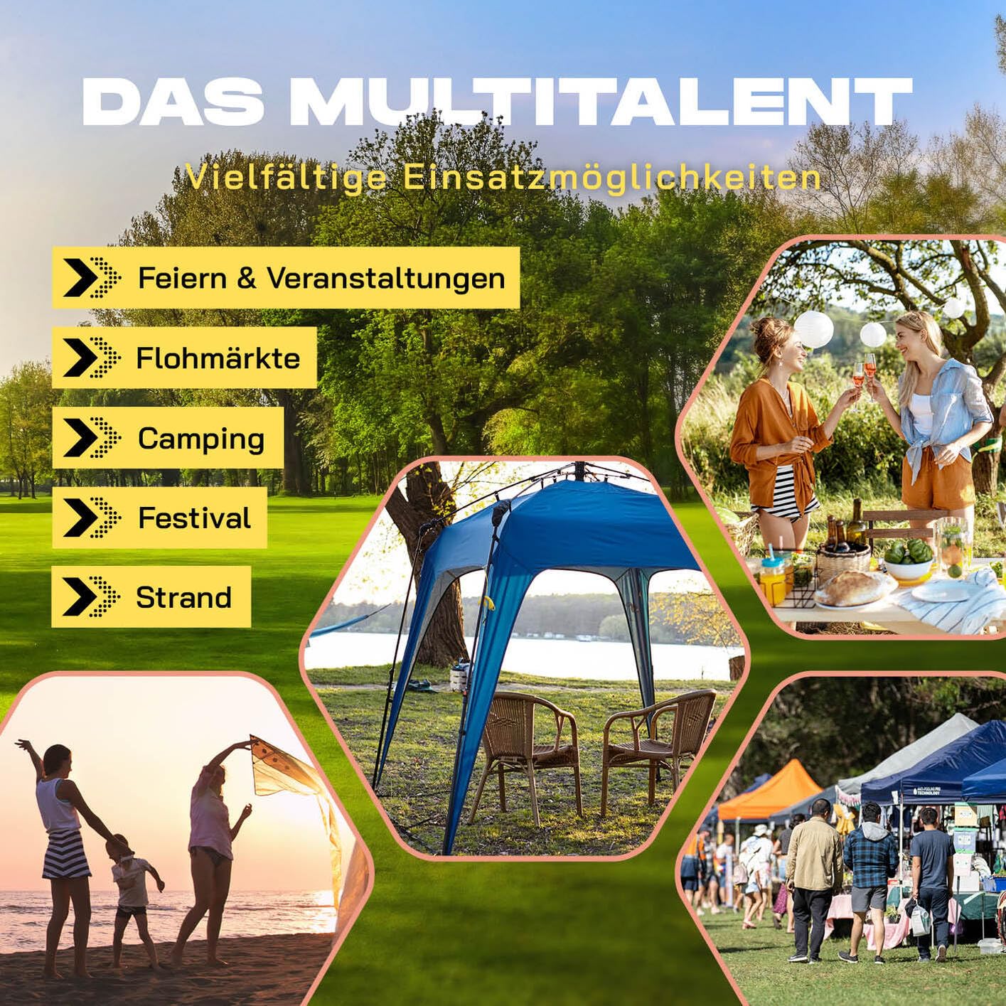Dank des cleveren Pop-Up-Systems ist der Pavillon in nur zwei Minuten aufgebaut, ganz ohne Werkzeug. Das innovative Faltsystem macht den Aufbau kinderleicht und ideal für spontane Einsätze im Garten, beim Camping oder am Strand.
