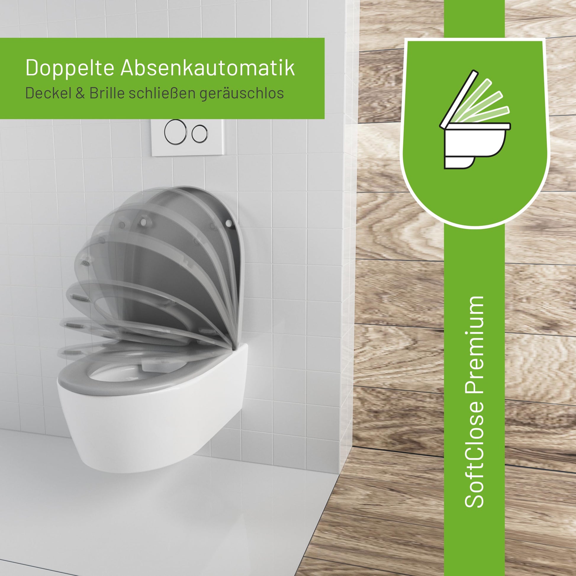 Die doppelte Absenkautomatik bedeutet, dass sowohl der Deckel als auch die Toilettenbrille sanft und beinahe geräuschlos schliessen. Dies verhindert lautes Zufallen, schont das Material und erhöht den Komfort im Badezimmeralltag.