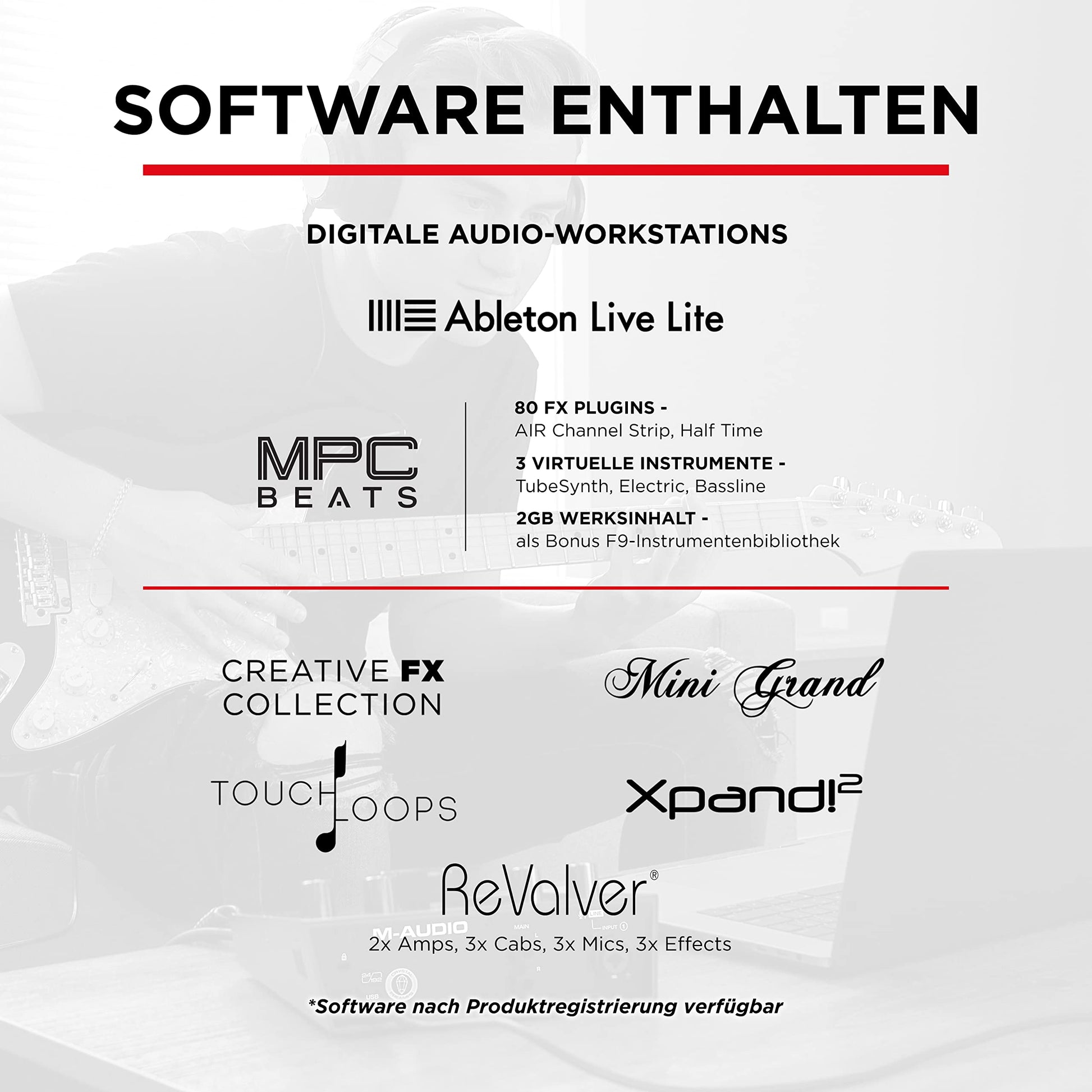 Ja, das Interface wird mit einem umfangreichen Software-Paket geliefert. Es enthält DAWs wie Ableton Live Lite und MPC Beats sowie eine Sammlung von virtuellen Instrumenten (Xpand!2, Mini Grand), Effekten und Loops, damit Sie sofort mit der Produktion Ihrer Ideen beginnen können.