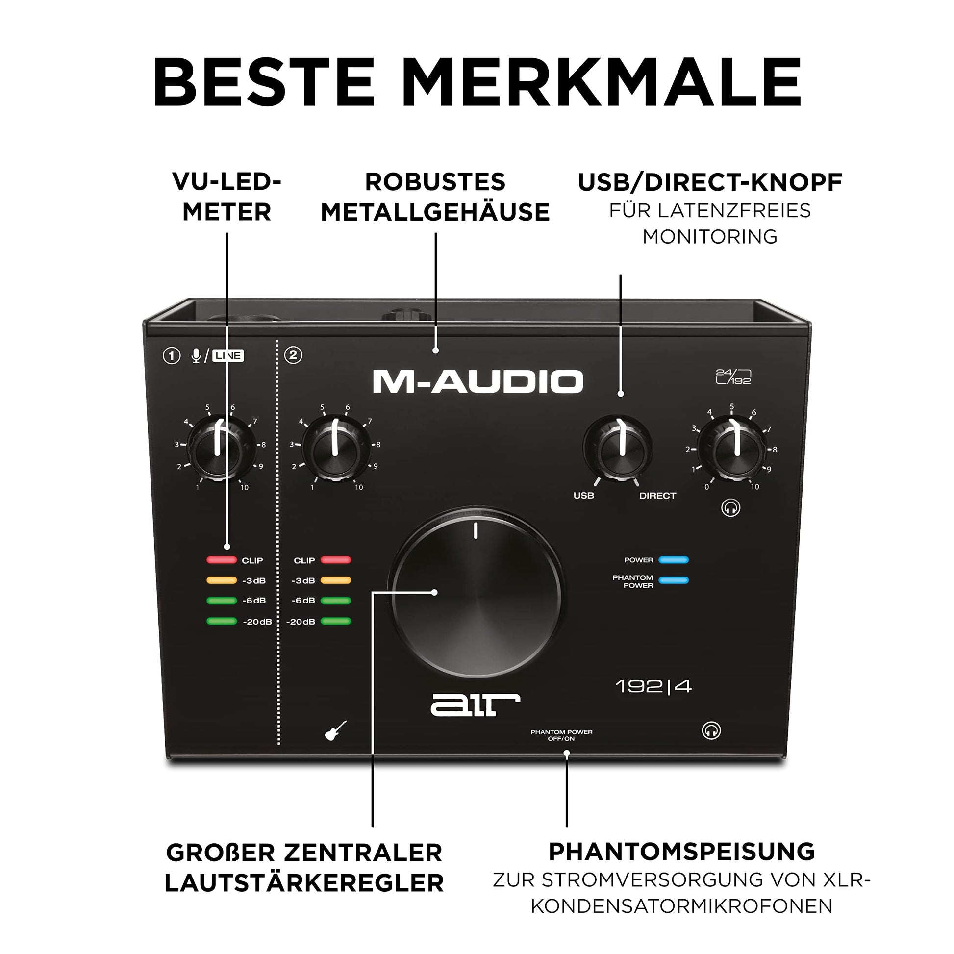Das M-Audio AIR 192|4 bietet eine leistungsstarke, zuverlässige und benutzerfreundliche Lösung für hochwertige Audioaufnahmen zu Hause oder unterwegs.
