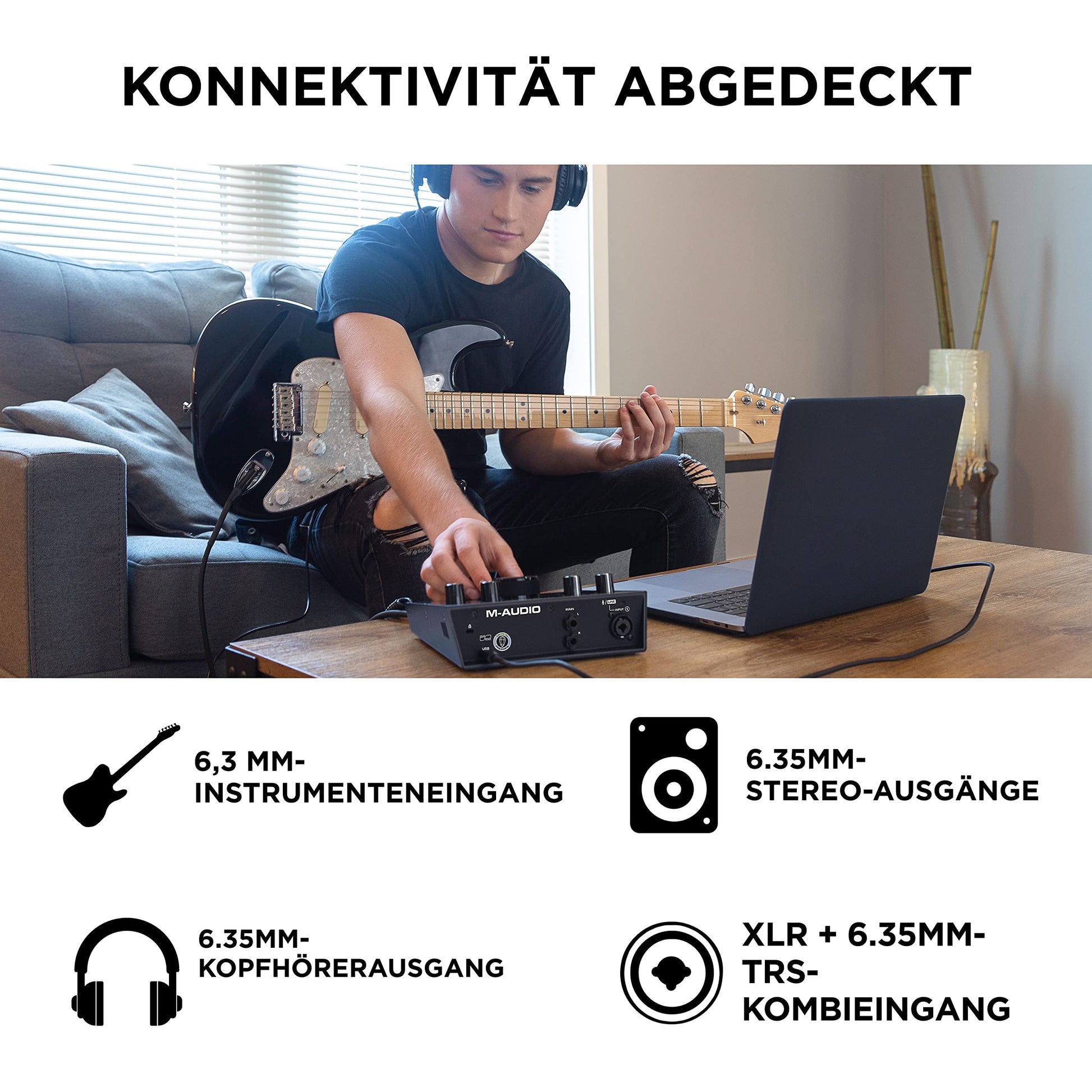 - Flexible Anschlüsse: Kombinierter XLR/+6,3mm TRS-Eingang, dedizierter 6,3mm Instrumenten-Eingang mit spezieller Gain-/Impedanzstufe, Stereo-Ausgänge (6,3mm) und Kopfhöreranschluss mit eigener Lautstärkeregelung.