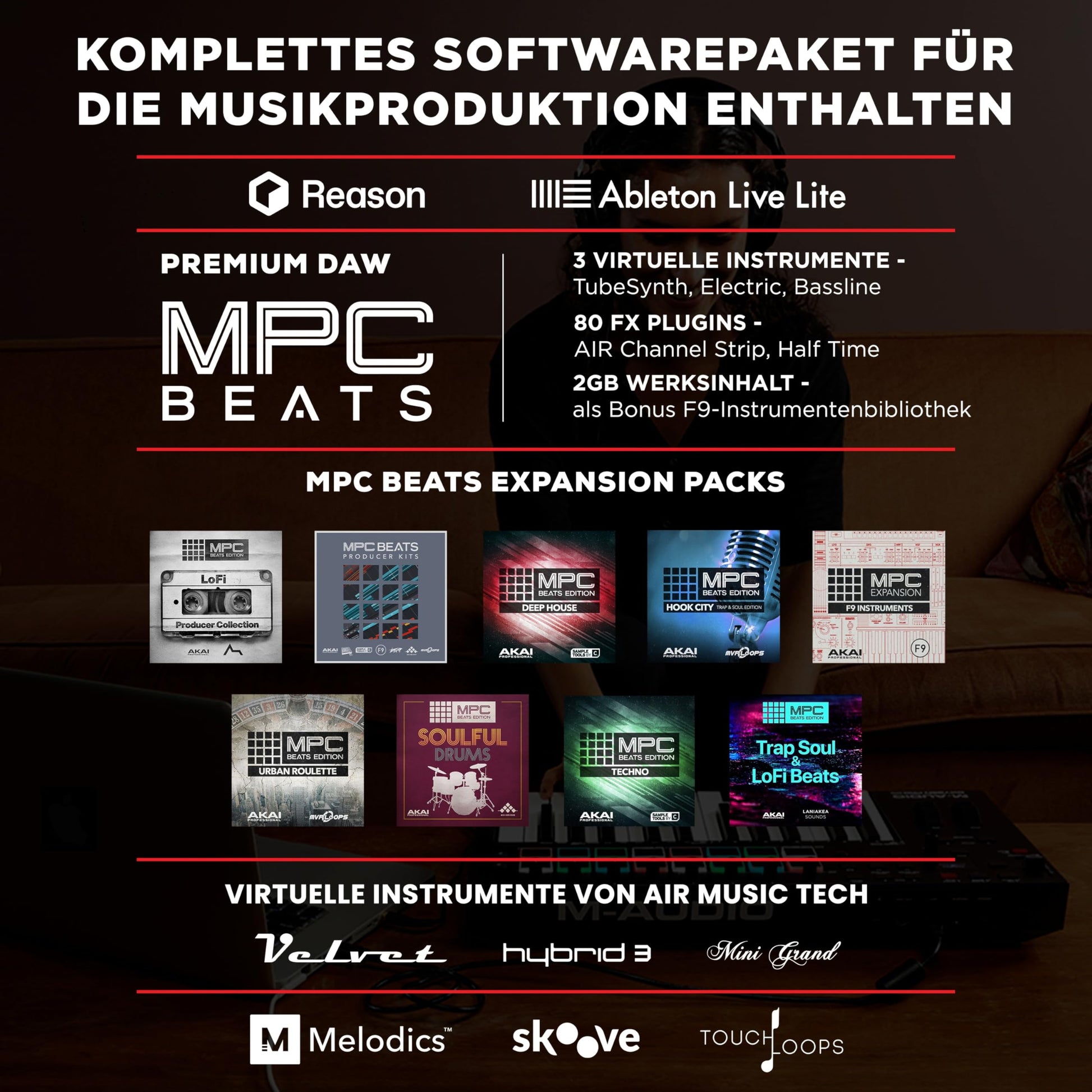 - Komplettes Softwarepaket: Starten Sie sofort durch mit MPC Beats, Ableton Live Lite, den virtuellen Instrumenten Mini Grand, Velvet, Hybrid 3 und über 80 Effekt-Plugins.