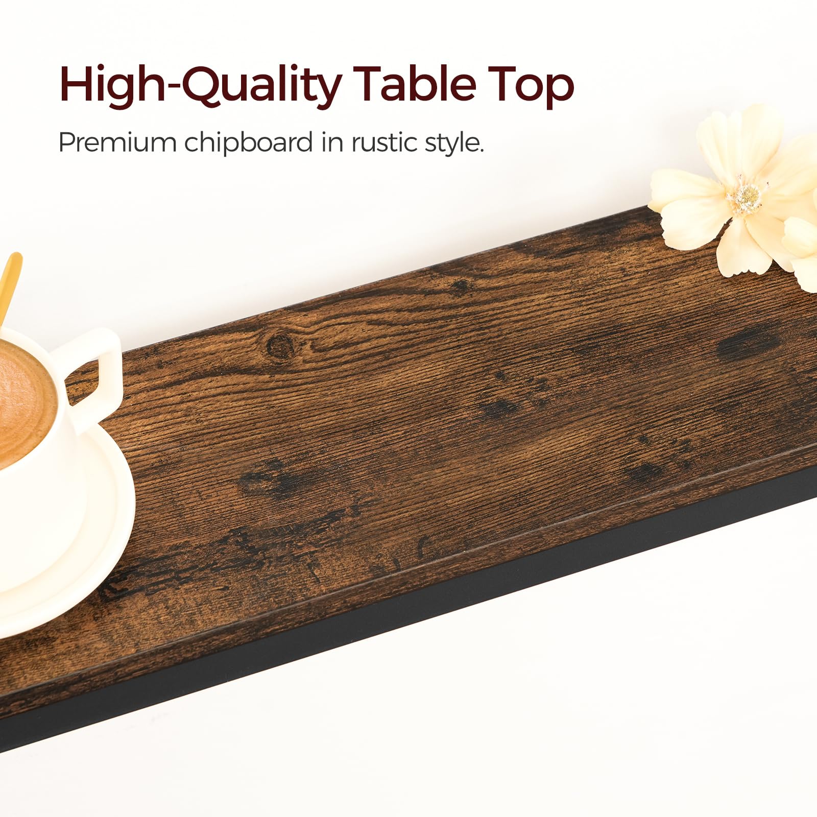 Der Tisch kombiniert eine robuste Tischplatte aus hochwertiger Spanplatte in Vintagebraun mit einem stabilen schwarzen Metallgestell. Dank dieser Konstruktion und zusätzlicher Verstrebungen kann die Tischplatte mit bis zu 20 kg belastet werden.