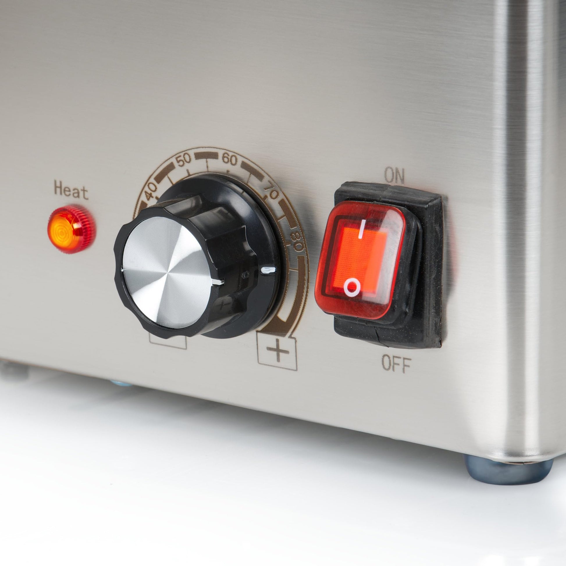 Die ideale Temperatur, um Würstchen heiss und servierfertig zu halten, liegt zwischen 60 °C und 75 °C. Mit dem stufenlosen Regler können Sie die Temperatur präzise bis 85 °C einstellen, um die Speisen perfekt temperiert zu halten, ohne dass sie an Qualität verlieren.