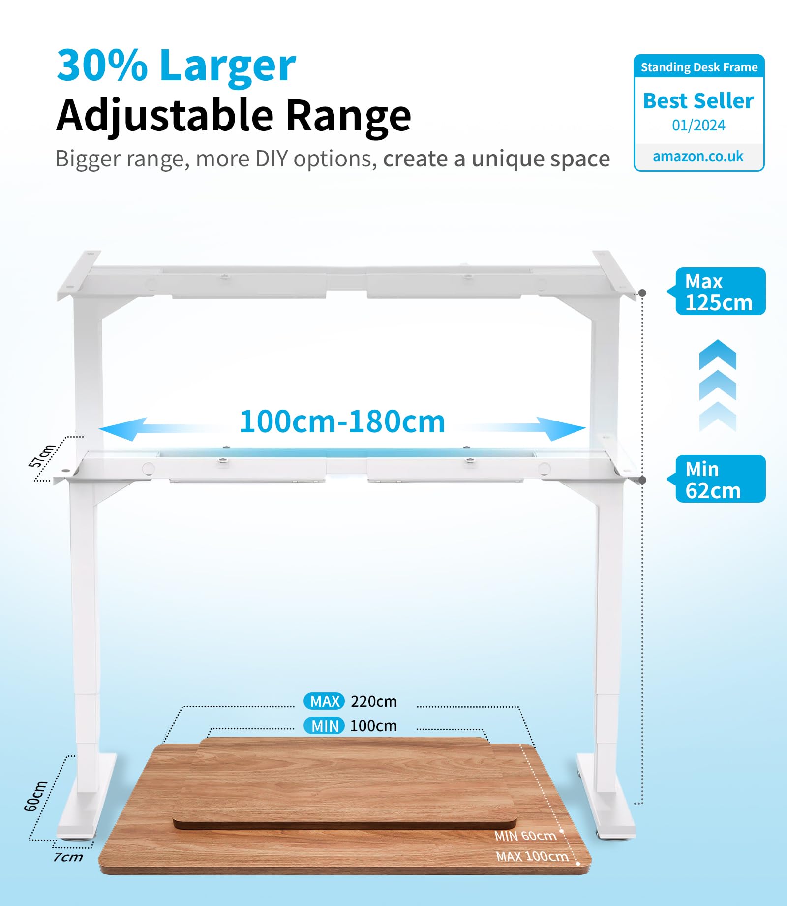 Das Gestell ist in der Breite von 100 cm bis 180 cm flexibel einstellbar. Es eignet sich daher ideal für Tischplatten mit einer Länge von 100 cm bis 220 cm und einer Breite von 60 cm bis 100 cm, sodass Sie Ihre Wunsch-Tischplatte frei wählen können.