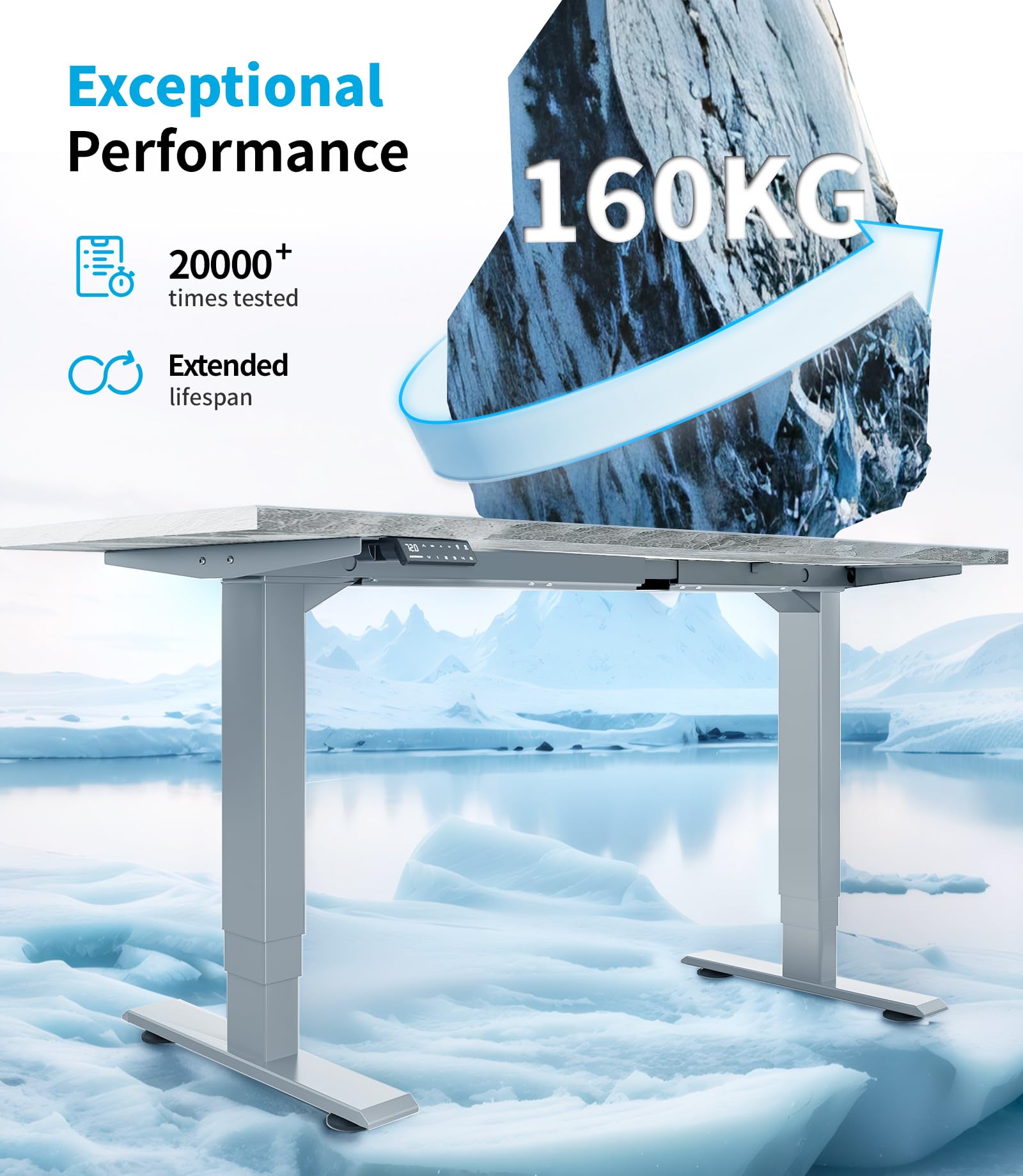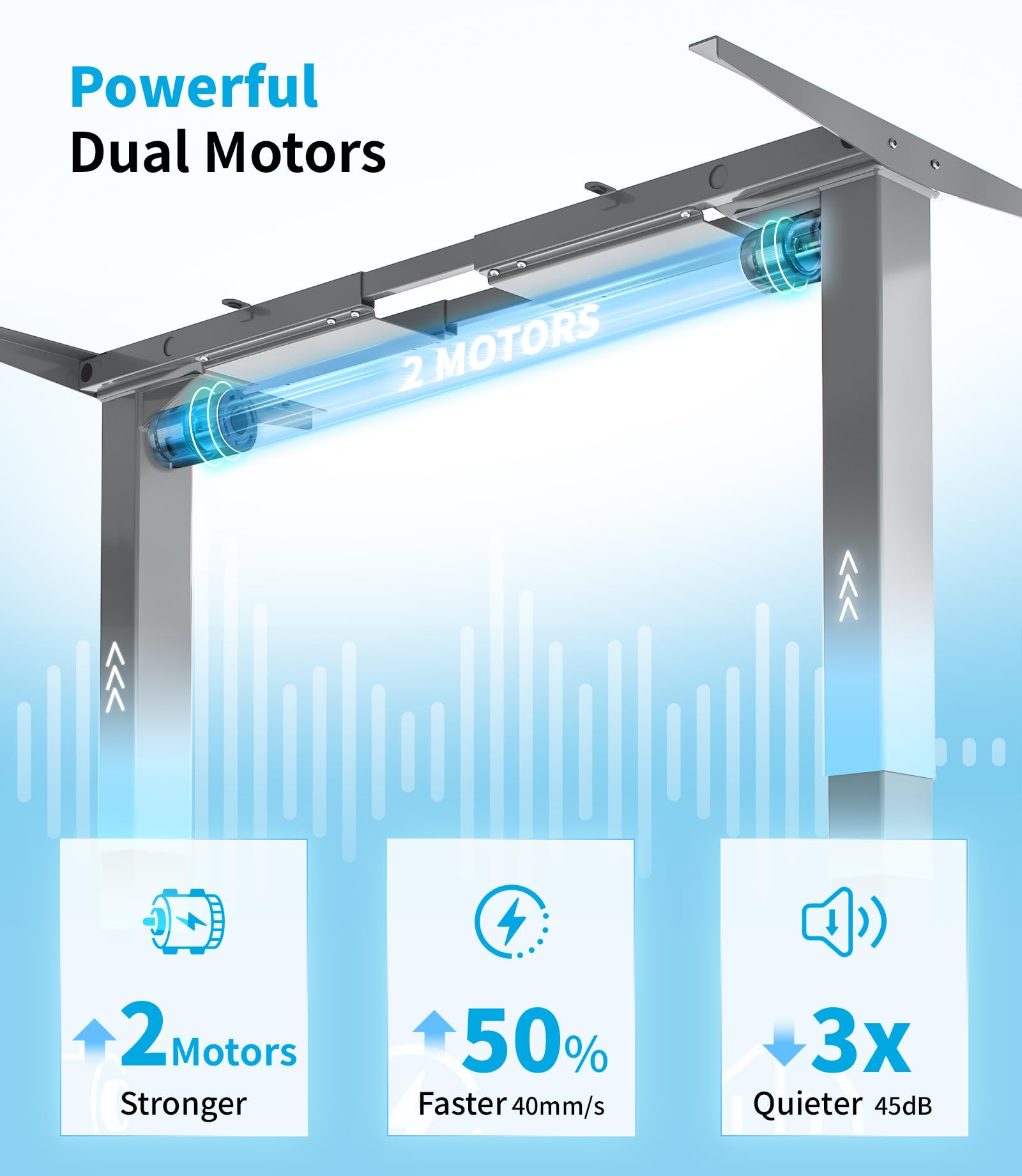 Das Gestell ist aus robustem Karbonstahl gefertigt und für eine beeindruckende Tragkraft von bis zu 160 kg ausgelegt. Das Doppelmotorsystem sorgt für eine schnellere (38 mm/s), stabilere und gleichmässigere Höhenverstellung, besonders bei hoher Last, und ist mit unter 45 dB zudem sehr leise.