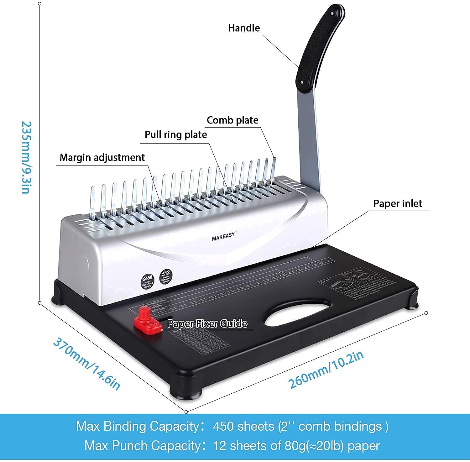 Das Gerät kann bis zu 12 Blätter (80g/m²) Papier gleichzeitig stanzen und Dokumente mit einem Umfang von bis zu 450 Seiten binden, was es ideal für umfangreiche Berichte, Schulprojekte oder Präsentationen macht.