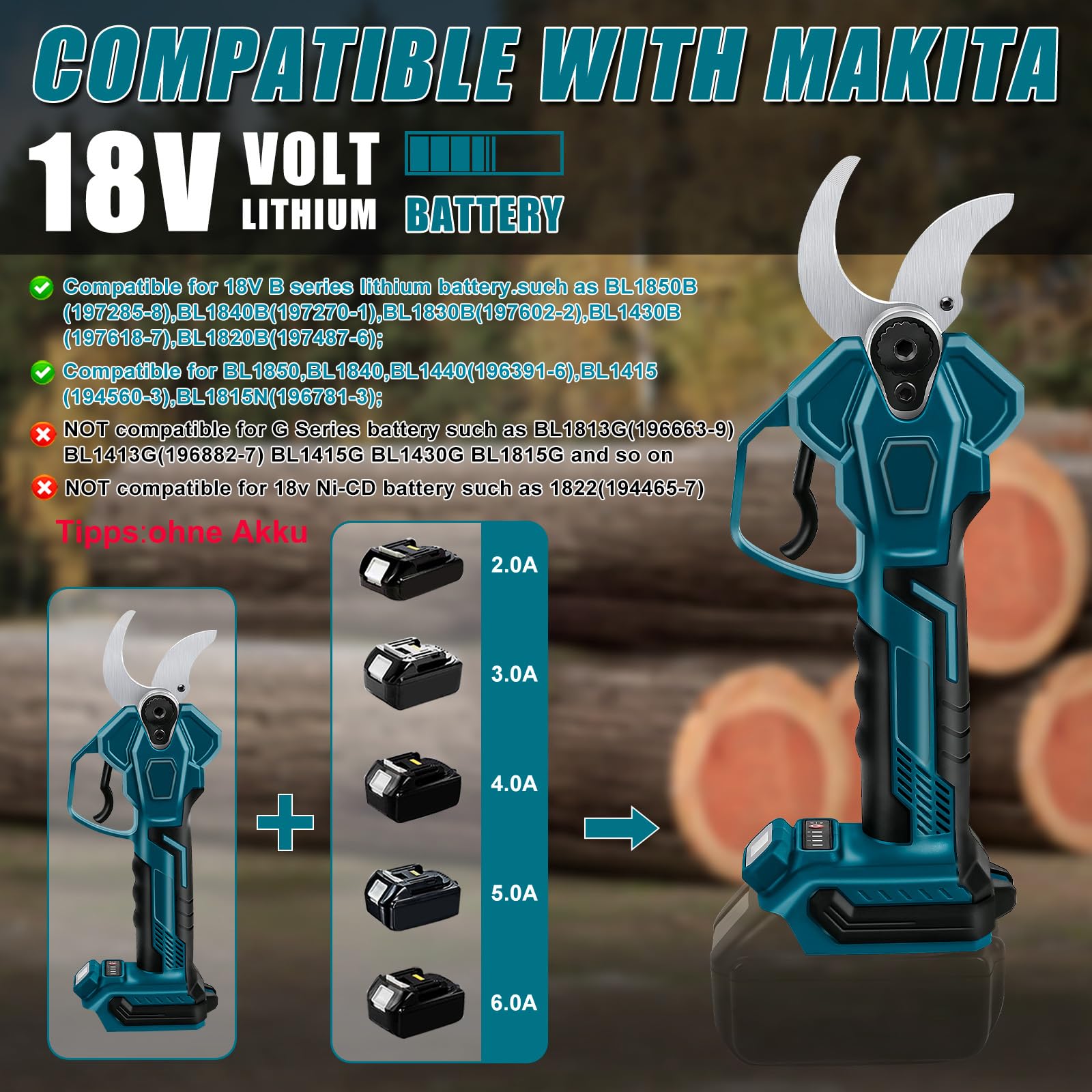 Die Astschere ist mit allen Makita 18V Lithium-Ionen-Akkus (z.B. BL1830, BL1850, BL1860B) kompatibel, jedoch nicht mit der G-Serie. Bitte beachten Sie, dass Akku und Ladegerät nicht im Lieferumfang enthalten sind; Sie können Ihre bereits vorhandenen, kompatiblen Akkus verwenden.