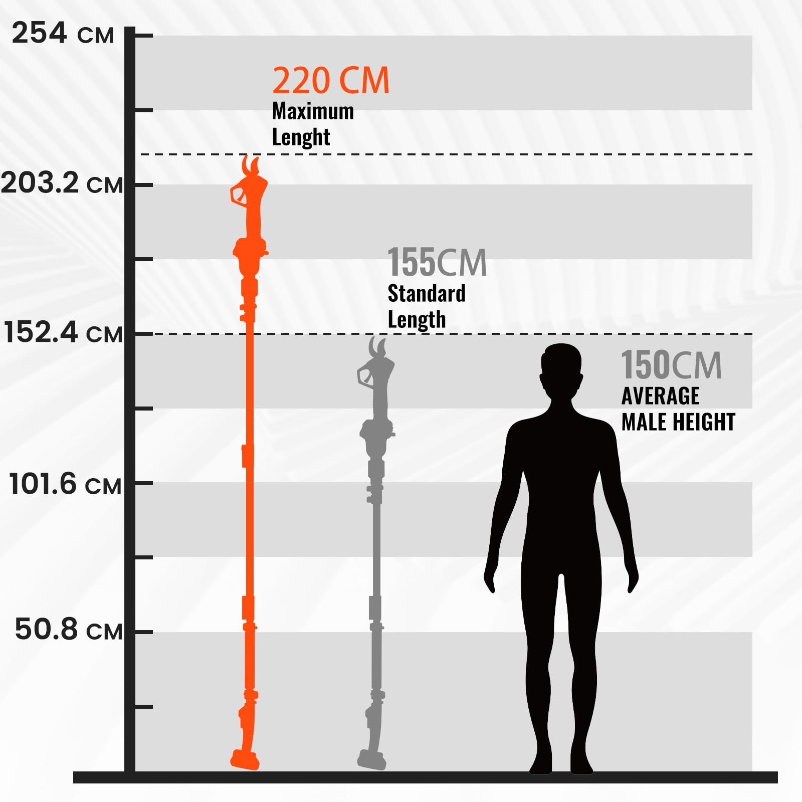 Die Stange ist stufenlos auf eine Gesamtlänge von bis zu 2,2 Metern ausziehbar. Für den einfachen Transport und eine platzsparende Lagerung lässt sie sich mittels Schnellverschluss auf eine kompakte Länge von nur 65 cm verkürzen.