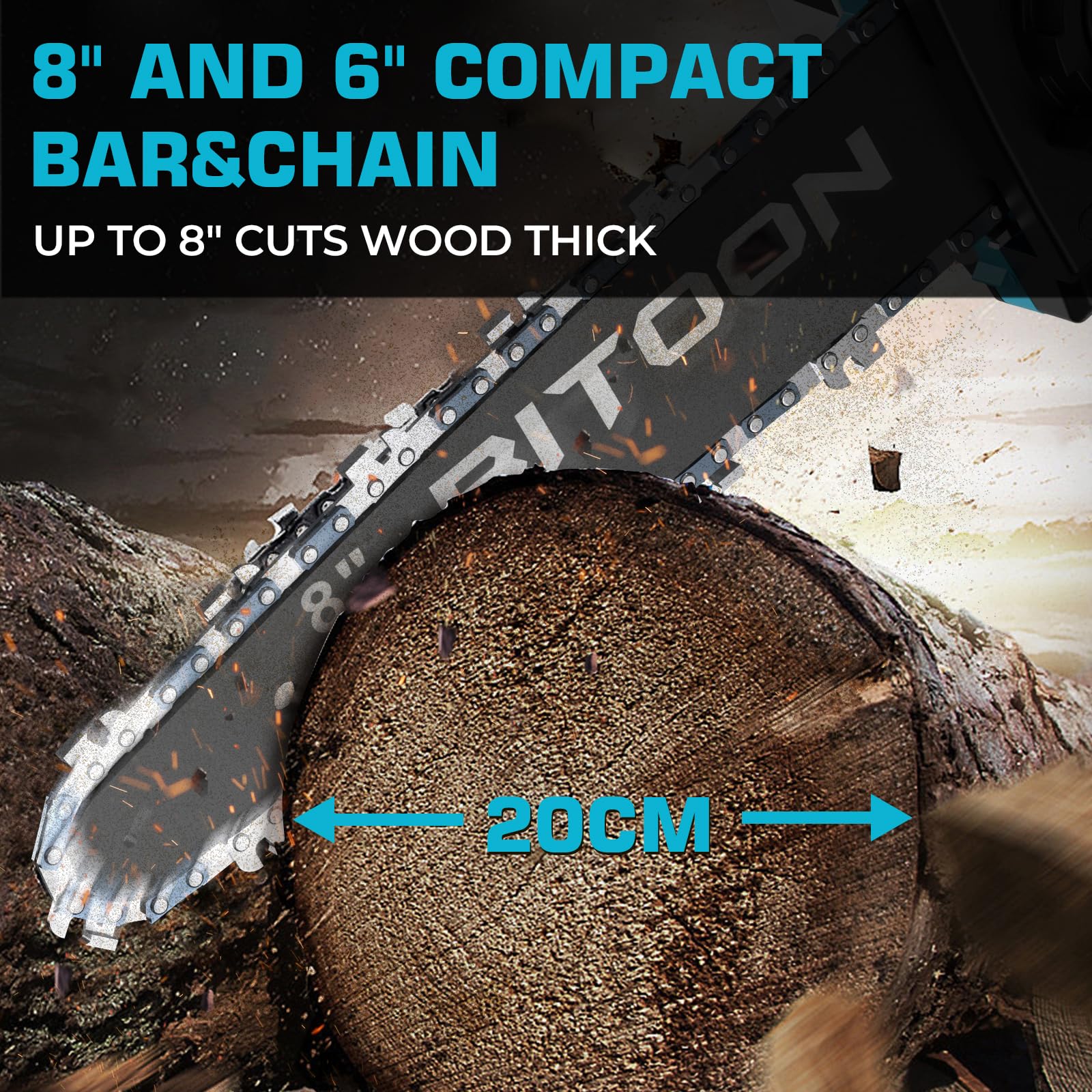 - Umfassender Lieferumfang: Sie erhalten die Akku-Kettensäge, einen Transportkoffer, je ein Set 8-Zoll-Schiene und -Kette (montiert), eine zusätzliche 8-Zoll-Ersatzkette, ein Set 6-Zoll-Schiene und -Kette, eine Ölflasche, einen Schwertschutz sowie eine Bedienungsanleitung.