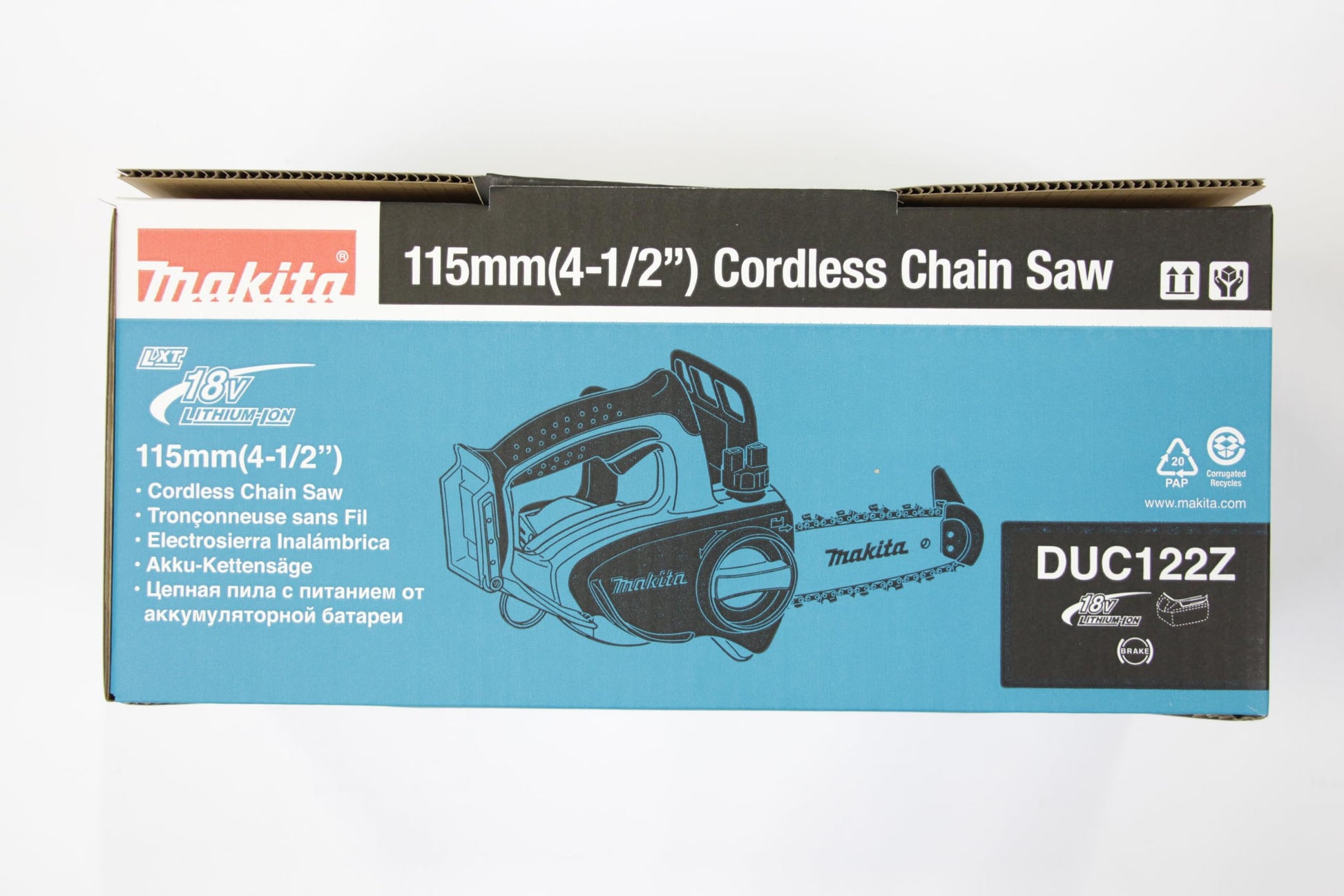 Der Lieferumfang umfasst die Kettensäge DUC122Z selbst, eine passende Sägekette, eine Sägeschiene und eine Sägekettenrundfeile. Die Lieferung erfolgt im Karton, jedoch explizit ohne Akku und Ladegerät.