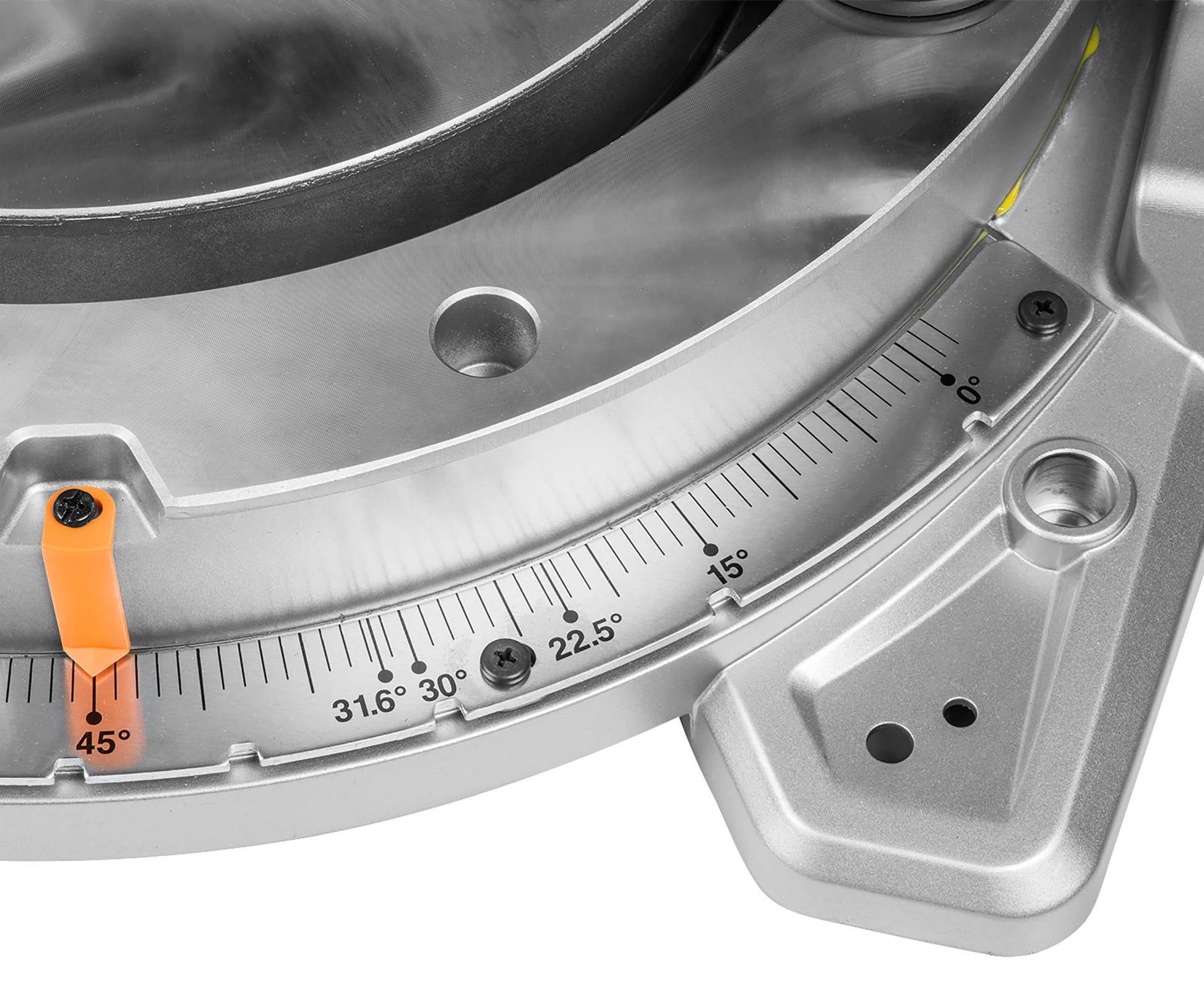Der grosszügig bemessene Arbeitstisch bietet eine stabile Auflagefläche für Ihre Werkstücke. In Kombination mit der stufenlosen Neigungsverstellung (bis 48°) und den Gehrungseinstellungen (bis 60°) beidseitig meistern Sie selbst komplexe Schnitte mit höchster Präzision. Die Neigungsverstellung ist zudem bequem an der Vorderseite des Geräts zugänglich.