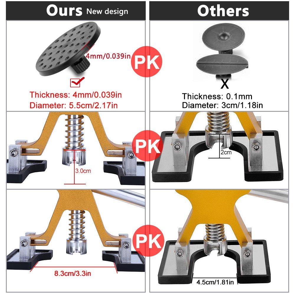 - Optimiertes Design: Der neue Dellen-Lifter lässt sich in der Höhe (um über 1 cm) und in der Breite (um über 3,8 cm) präzise einstellen. Die Klebelaschen sind dicker und haben einen grösseren Durchmesser, was eine effektivere und langlebigere Zugwirkung ermöglicht.