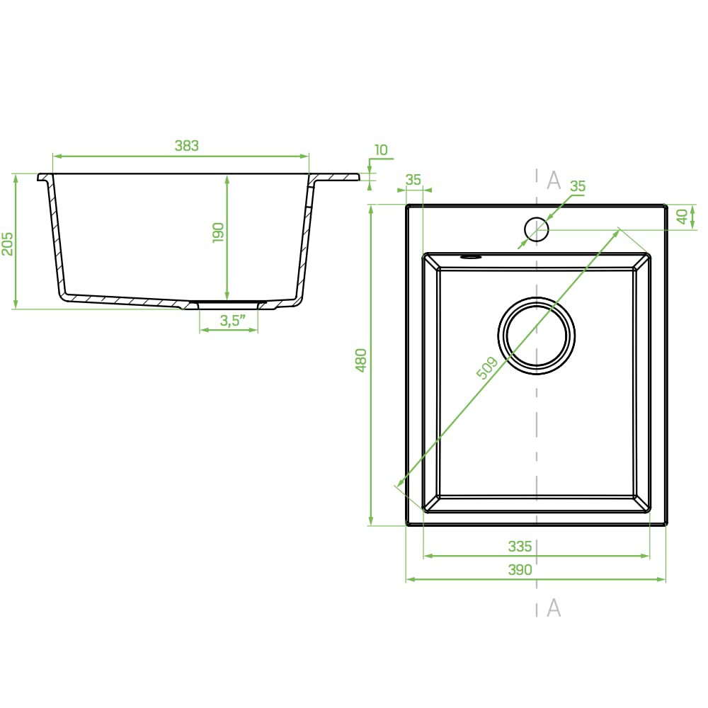 Die Spüle hat die kompakten Aussenmasse von 48 x 39 cm. Sie ist für den Einbau in Unterschränke mit einer Mindestbreite von 40 cm konzipiert, was sie ideal für kleinere Küchen oder zusätzliche Spülbereiche macht.