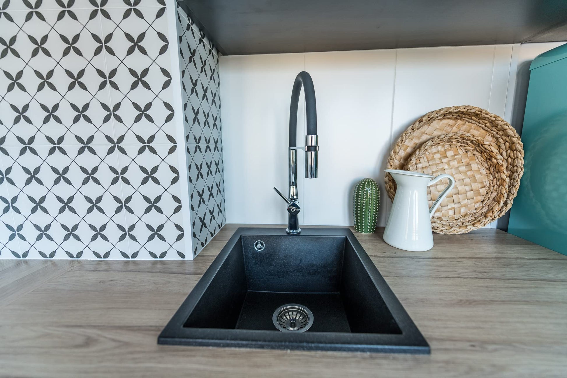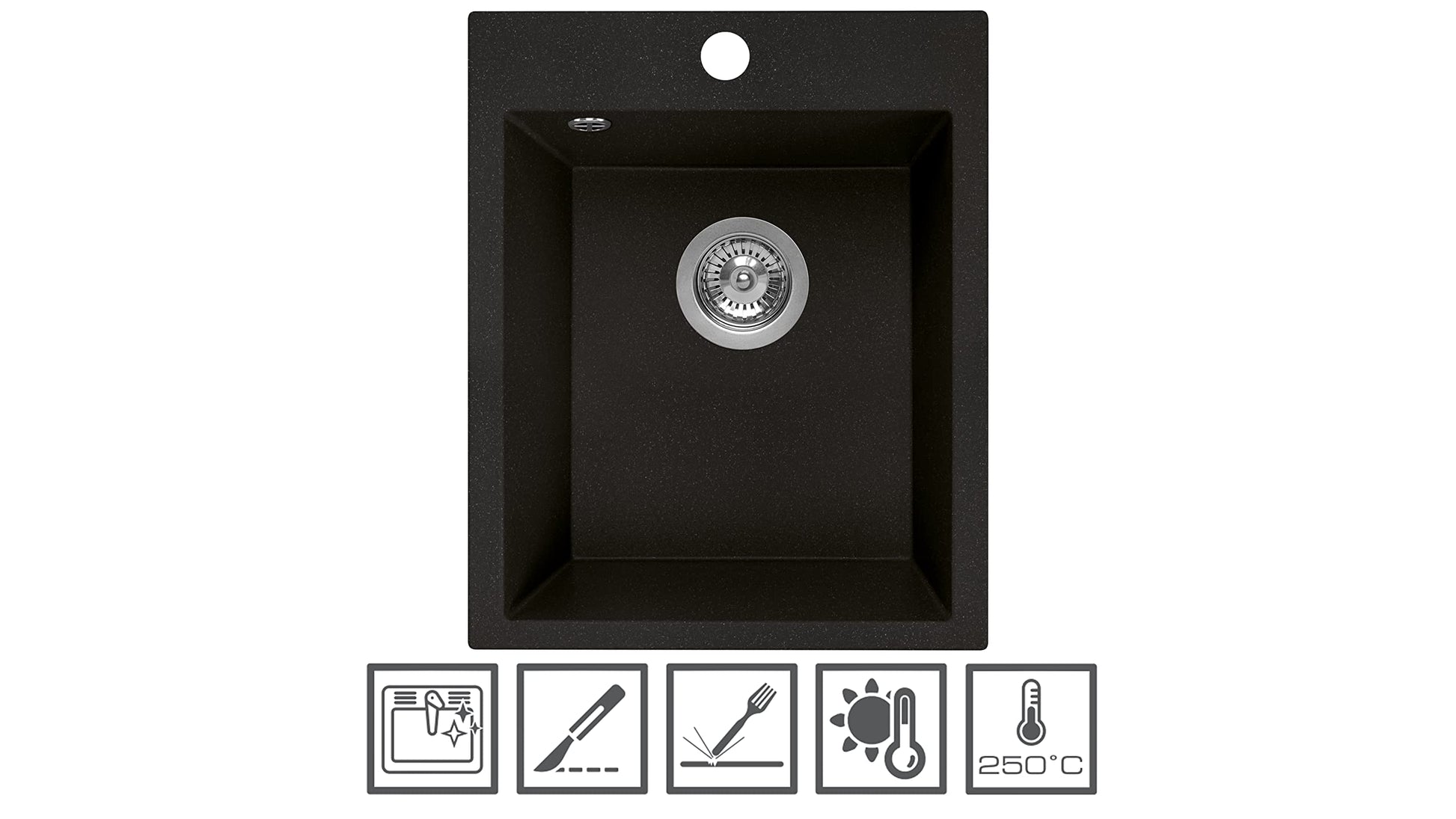 Die Spüle besteht aus einem hochwertigen Verbundwerkstoff mit 80 % Quarzsand. Dieses Material macht sie ausserordentlich robust gegen Stösse, Kratzer und thermische Schocks von heissen Töpfen bis zu 250 °C, ideal für den täglichen Küchengebrauch.