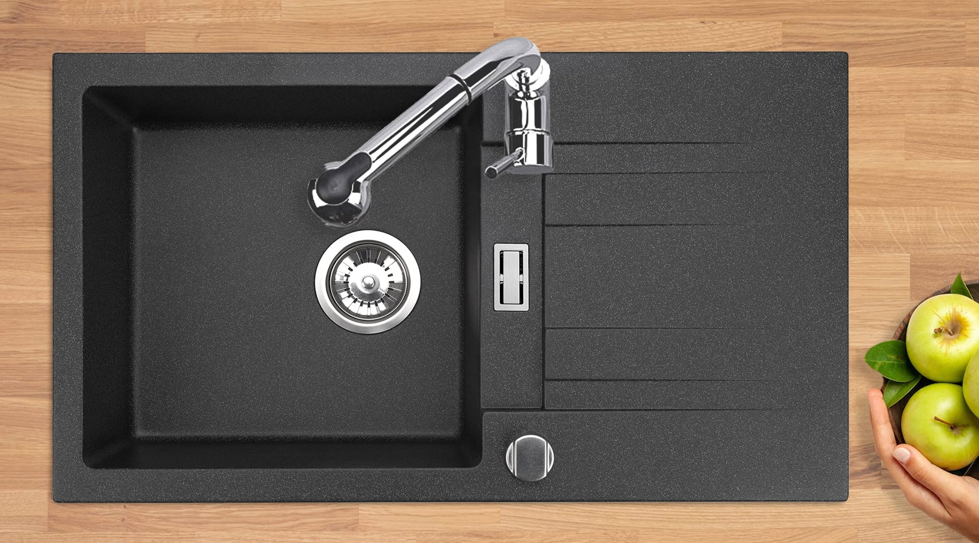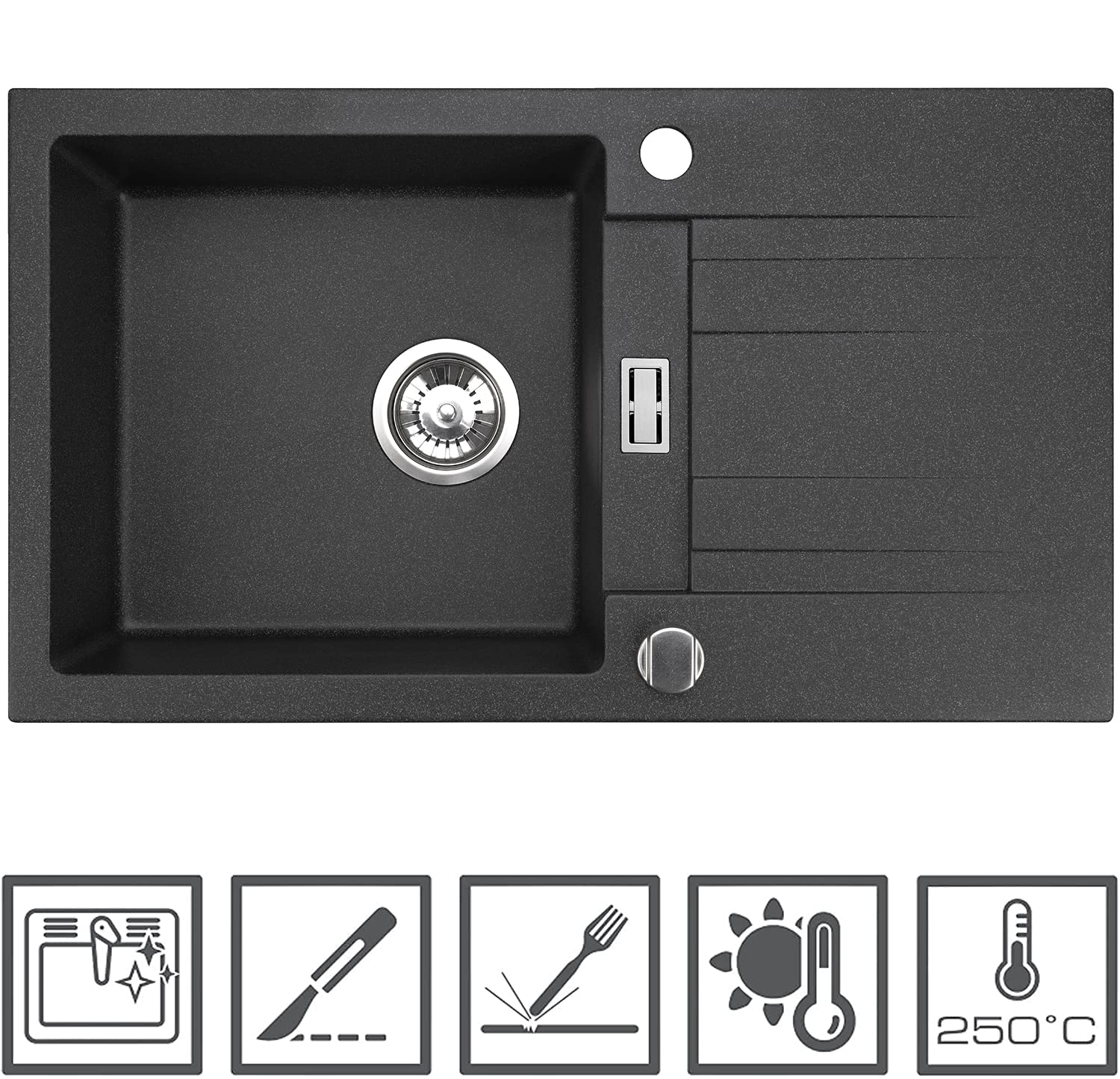 Die Spüle besteht aus einem hochwertigen Granit-Verbundwerkstoff mit 80% Quarzsand, gefertigt in der EU. Dies macht sie aussergewöhnlich robust und langlebig. Sie ist widerstandsfähig gegen Stösse, Kratzer, Schmutz und hitzebeständig bis 250°C, sodass auch heisse Töpfe kein Problem darstellen.