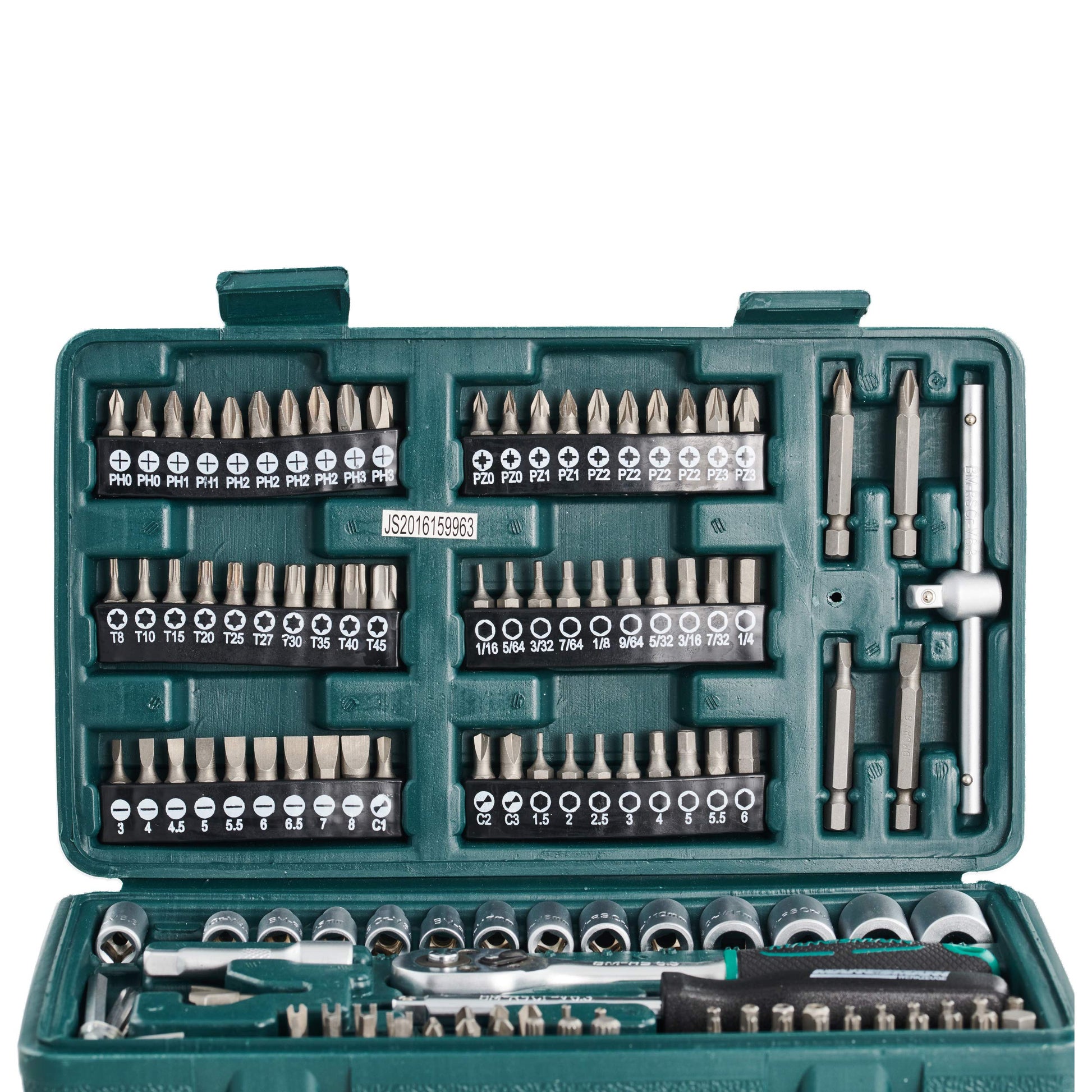 - Hauptkomponenten: 1 Umschaltknarre (72 Zähne), 1 Verlängerung (50 mm), 1 Schraubgriff, 1 T-Gleitgriff, 13 Steckschlüsseleinsätze (4-14 mm), 7 Innensechskantschlüssel, 1 Bitadapter und 104 diverse Bits.