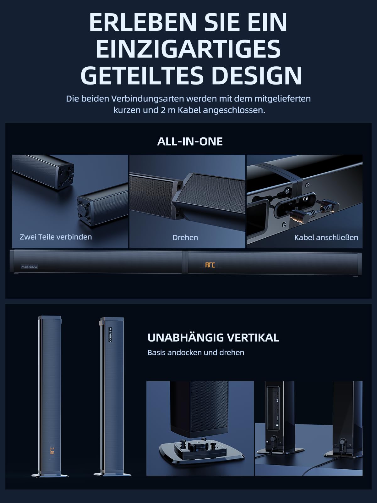 - Flexibles 2-in-1-Design: Die Soundbar kann als eine durchgehende Leiste oder als zwei separate vertikale Lautsprecher aufgestellt werden, perfekt für TV- und PC-Setups.