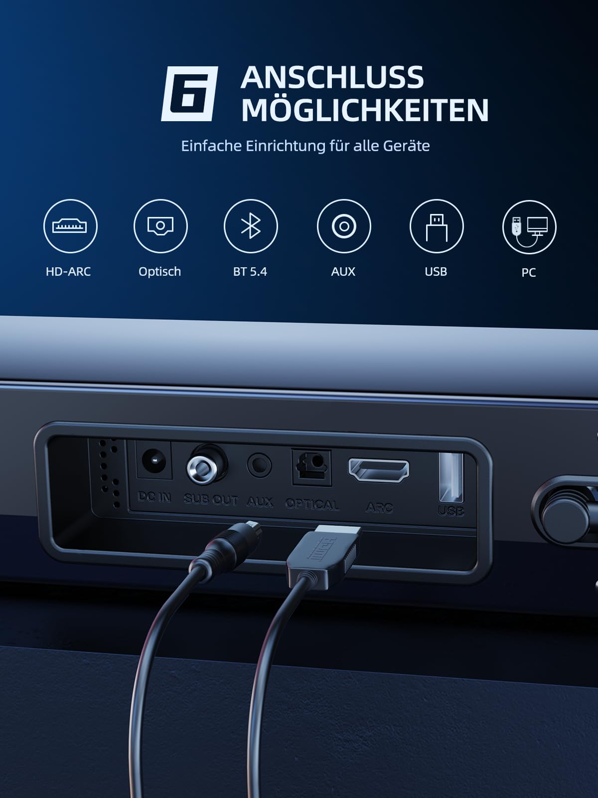 Die Soundbar bietet umfassende Konnektivität für 99 % aller gängigen Geräte. Sie verfügt über HD-ARC, einen optischen Anschluss, zwei USB-Anschlüsse (für Stick und direkte PC-Kabelverbindung) sowie einen AUX-Eingang. Zusätzlich ermöglicht der neuste BT 5.4-Chip eine stabile kabellose Verbindung.