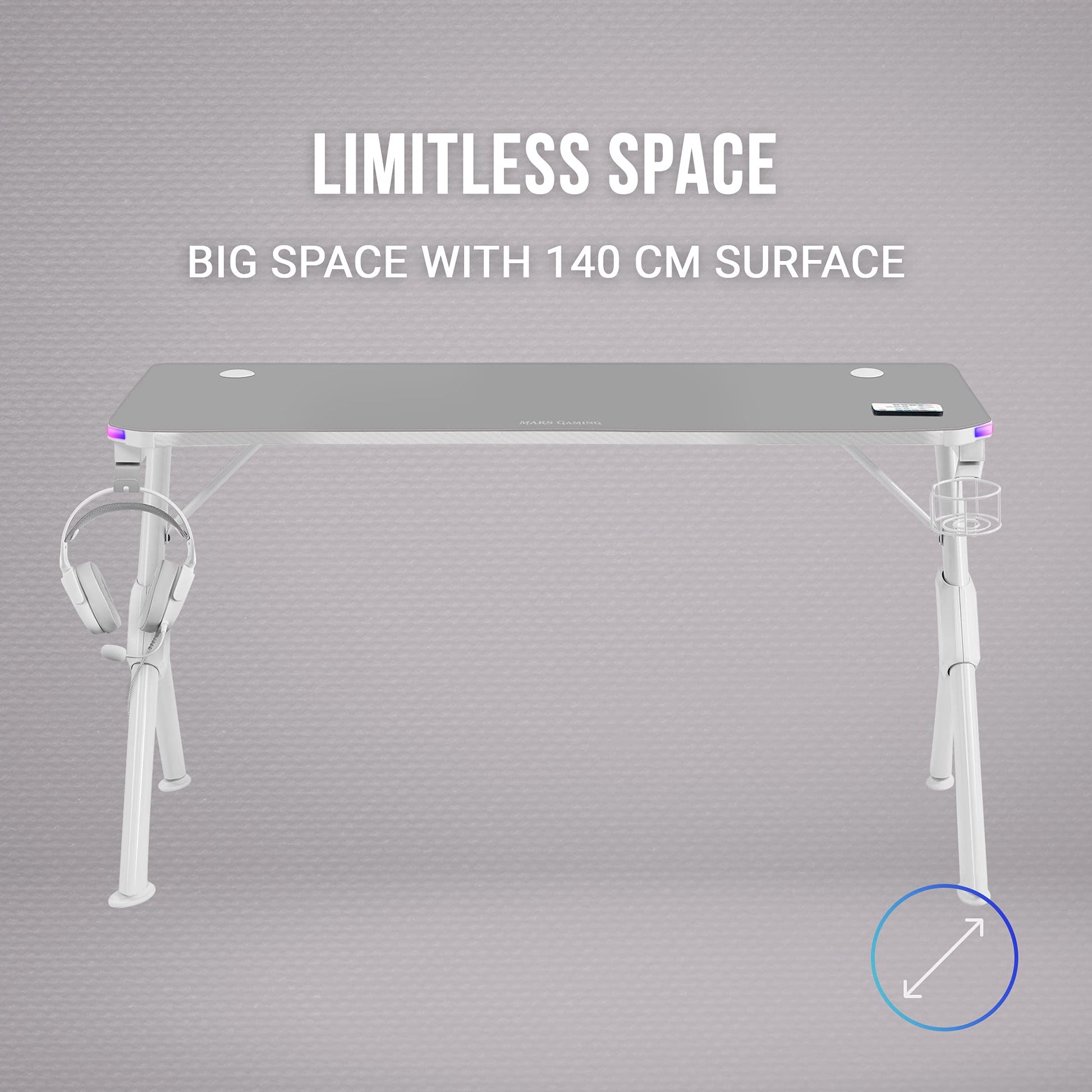 Dieser 140 cm breite Gaming-Tisch bietet eine umfassende Ausstattung für das ultimative Spielerlebnis. Er kombiniert eine robuste Bauweise mit spektakulärer Beleuchtung und durchdachten ergonomischen Features.