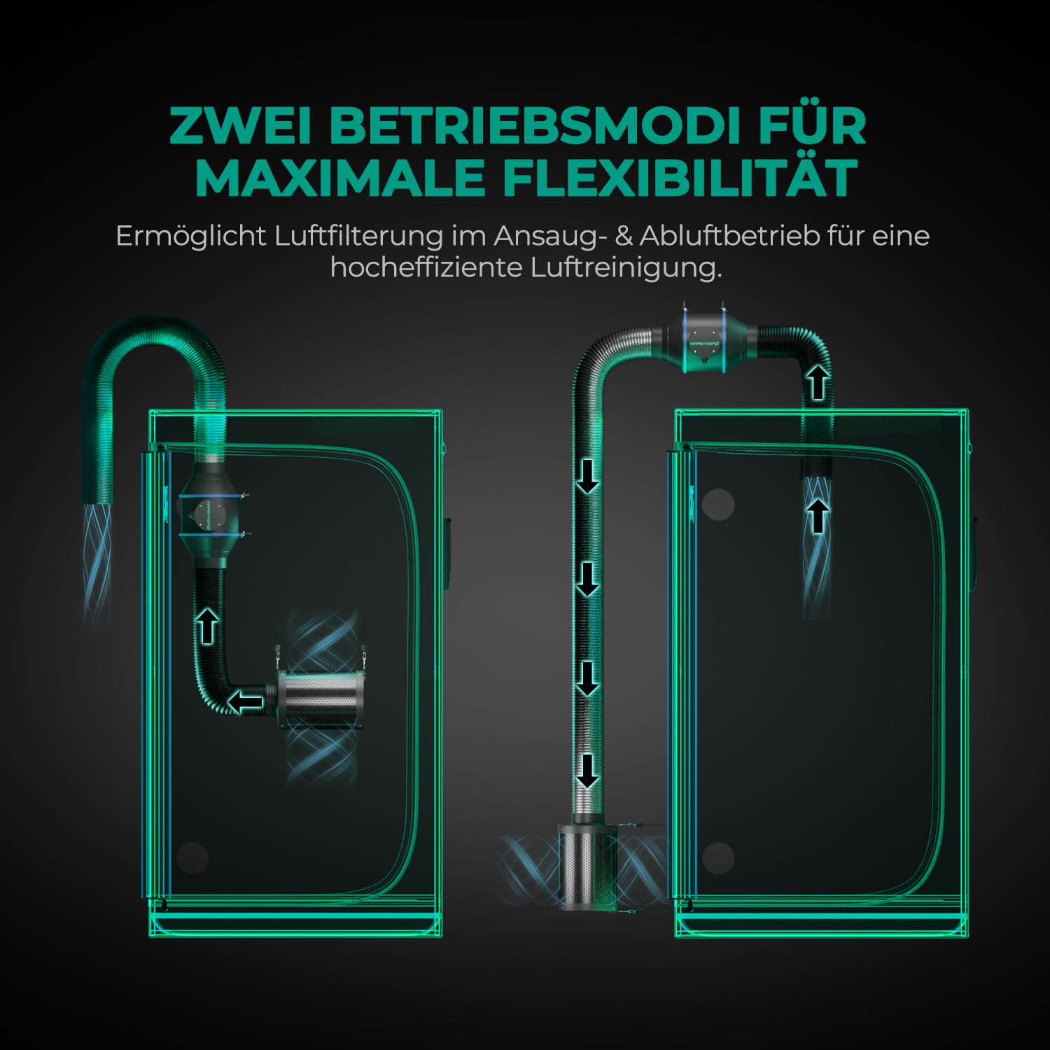 Die Vielseitigkeit des Filters erlaubt den Einsatz in verschiedenen Konfigurationen. In Kombination mit einem passenden 150mm Rohrventilator kann er sowohl für die Zuluft (Ansaugung) als auch für die Abluft (Ausstoss) verwendet werden. Dies macht ihn zur perfekten Lösung für Grow-Räume, Hydroponik-Systeme, Indoor-Growzelte und Keller.