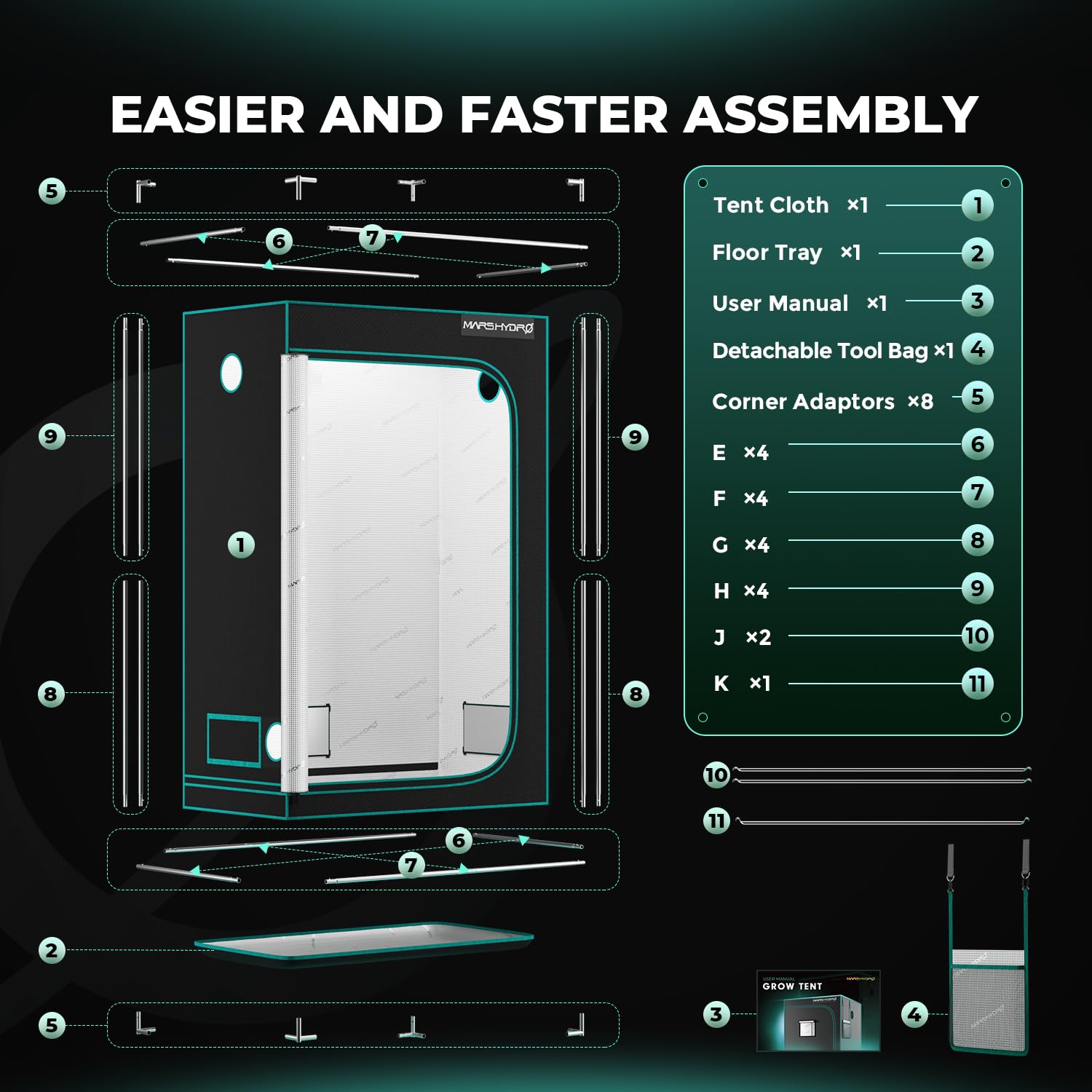 - 100% Lichtdichtigkeit: Das Zeltinnere ist mit hochreflektierendem Diamant-Mylar ausgekleidet. Eine spezielle Stofflasche über dem Reissverschluss und das doppelt genähte, reissfeste 1680D-Zeltmaterial verhindern jeglichen Lichteinfall und halten das gesamte Licht im Inneren.