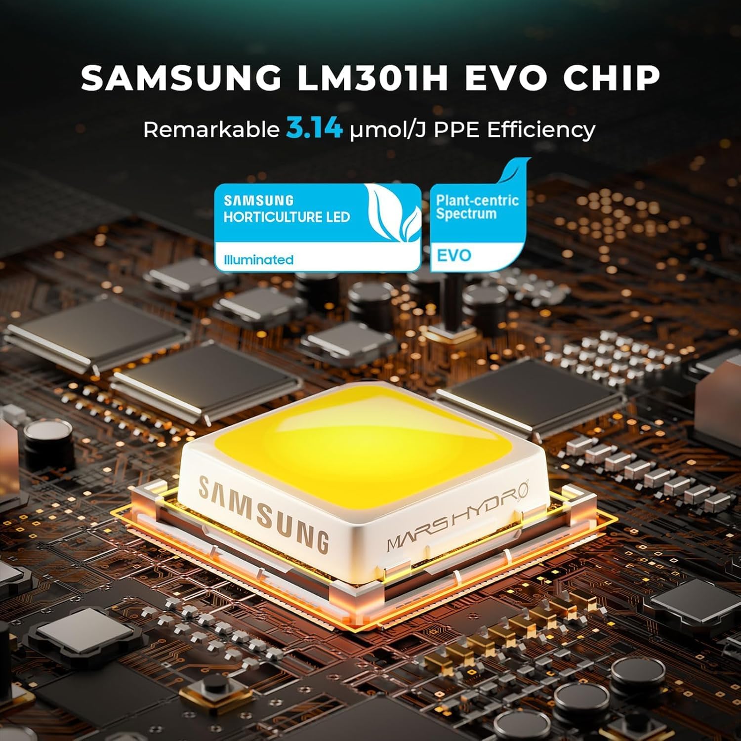 - Herausragende Effizienz: Ausgestattet mit modernsten Samsung LM301H EVO-Dioden, die eine bemerkenswerte Effizienz von 3,14 μmol/J pro Diode und einen Gesamt-PPE von 2,85 μmol/J erreichen.